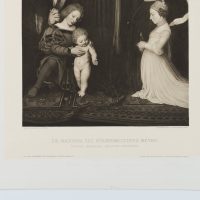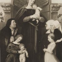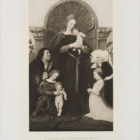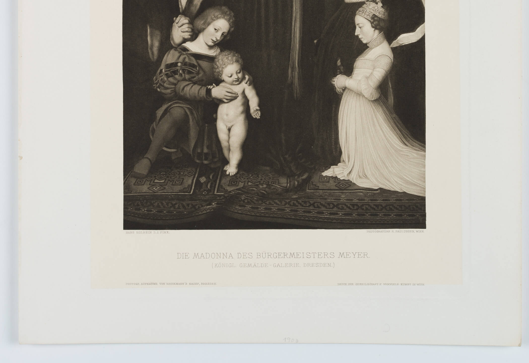 - Bezeichnung: Unten mittig im Druck signiert: “Hans Holbein D.J. pinx | Photogravure R. Paulussen, Wien”. Unten mittig im Druck bezeichnet: “Die Madonna des Bürgermeisters Meyer (Königl. Gemäldegalerie Dresden)”.