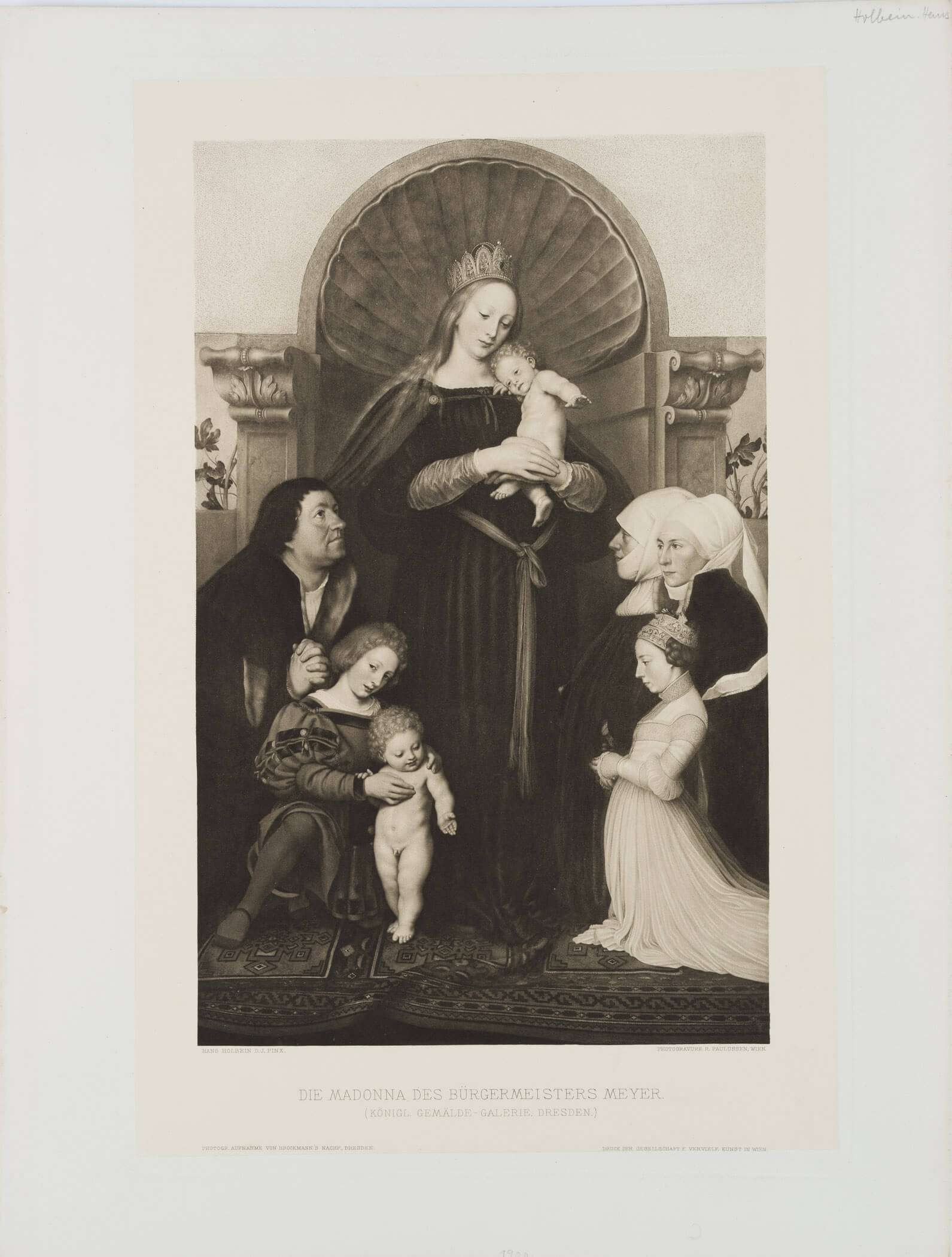 - Inscription: Lower middle signed in the printing plate: “Hans Holbein D.J. pinx | Photogravure R. Paulussen, Wien”. Lower middle inscribed in the printing plate: “Die Madonna des Bürgermeisters Meyer (Königl. Gemäldegalerie Dresden)”.