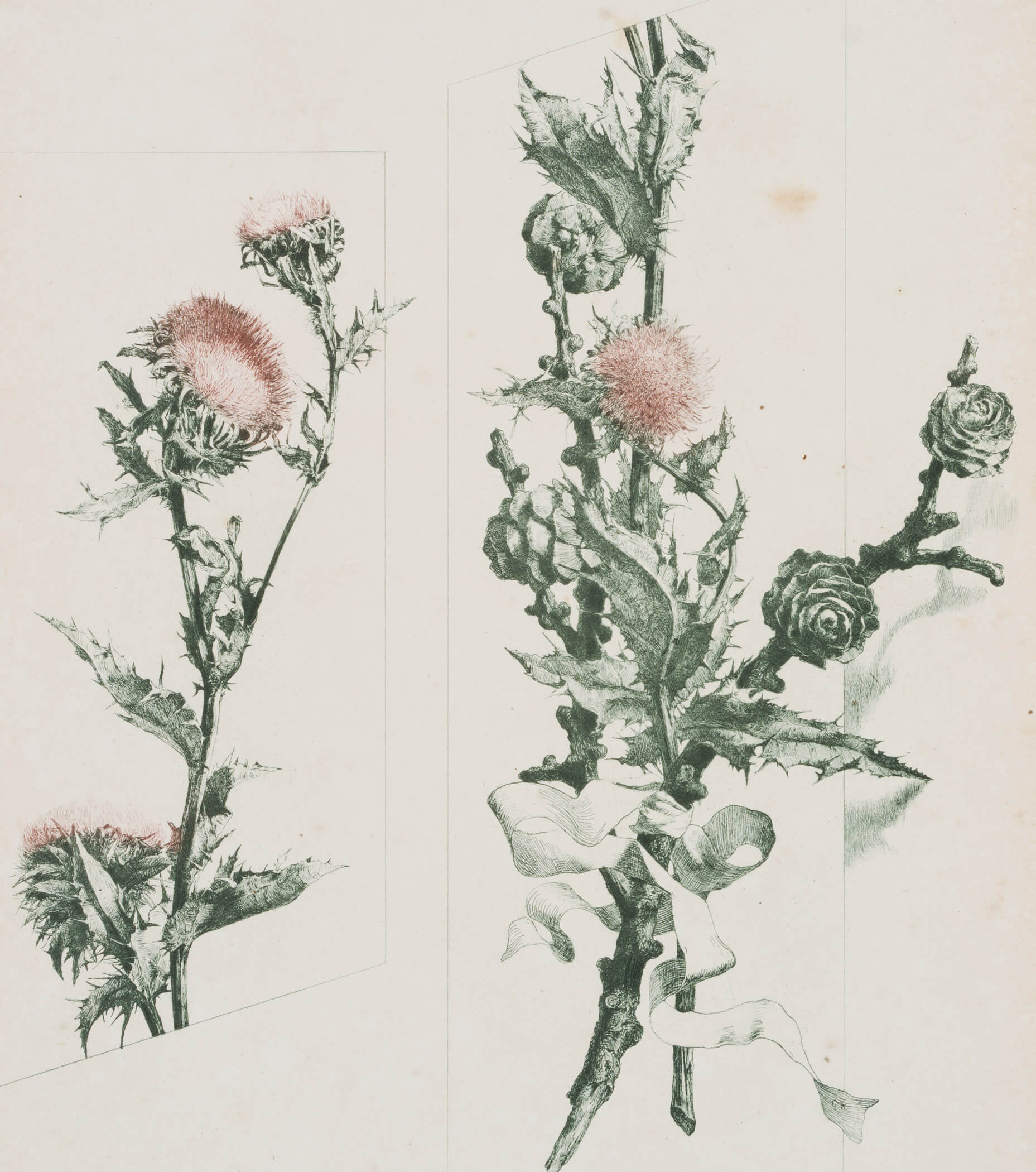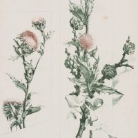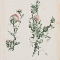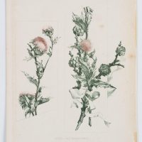 - Description: Botanical illustration. Two views of a thistle with pinkish yellow flowers and thistle with pine branch