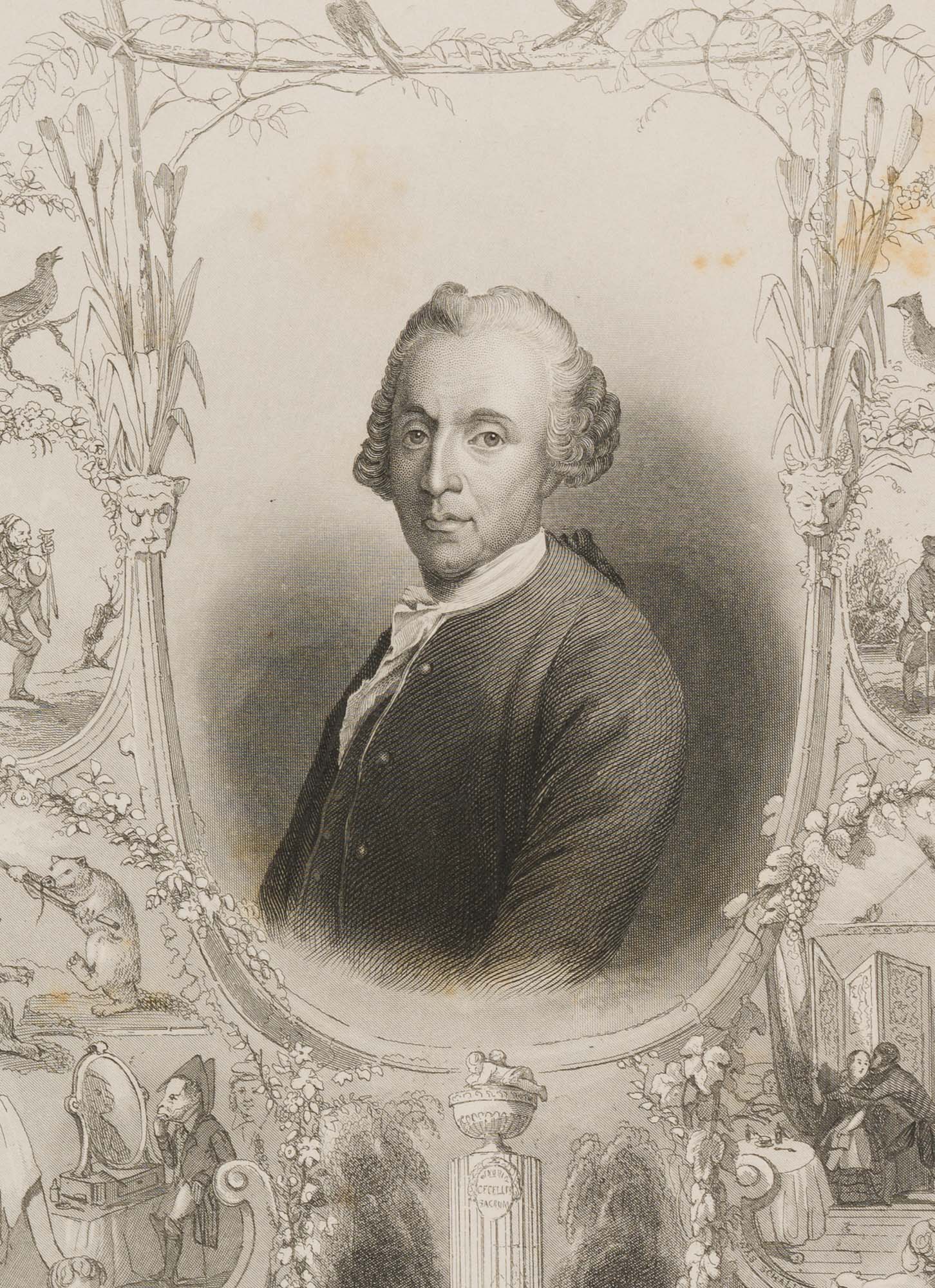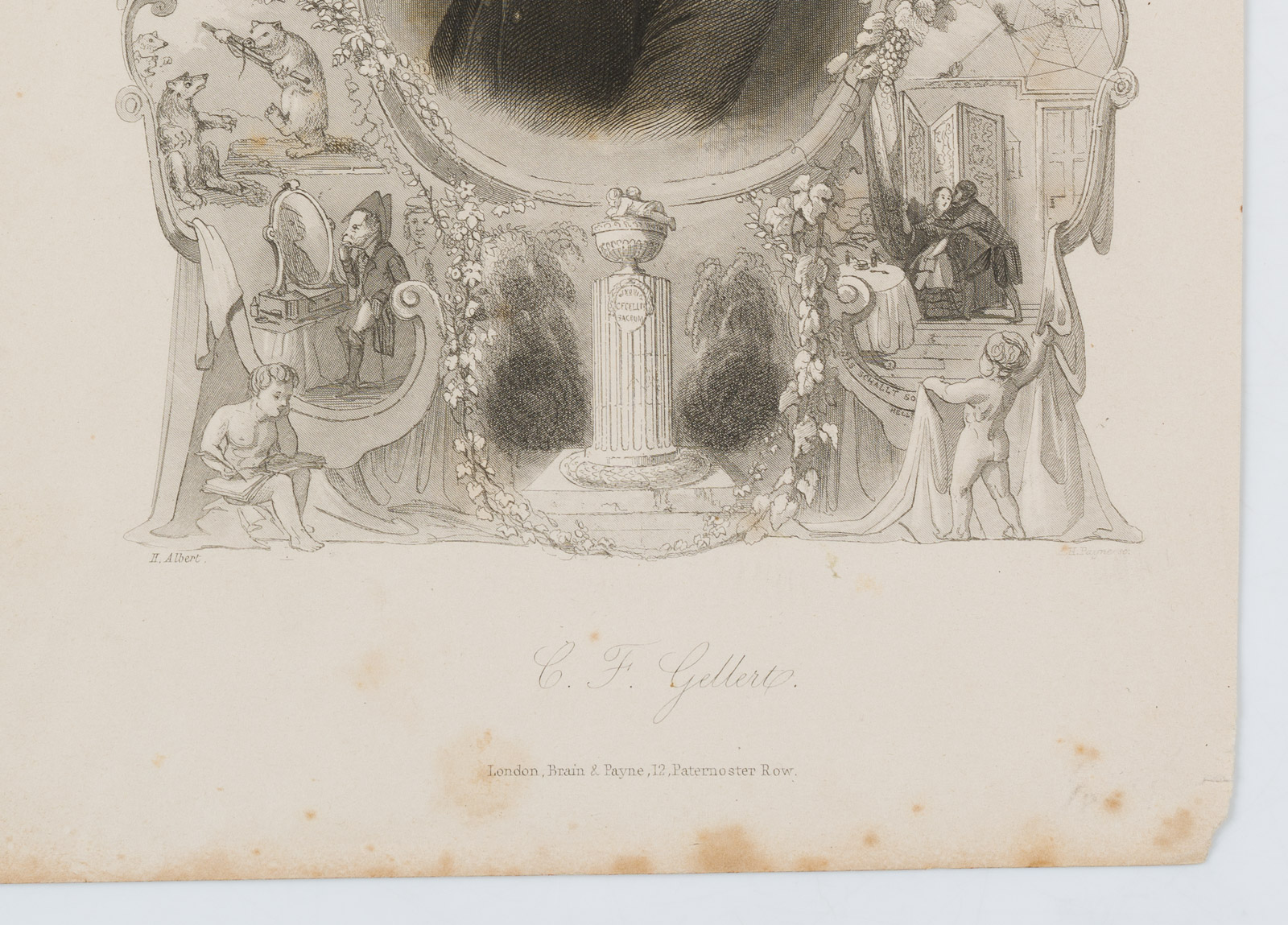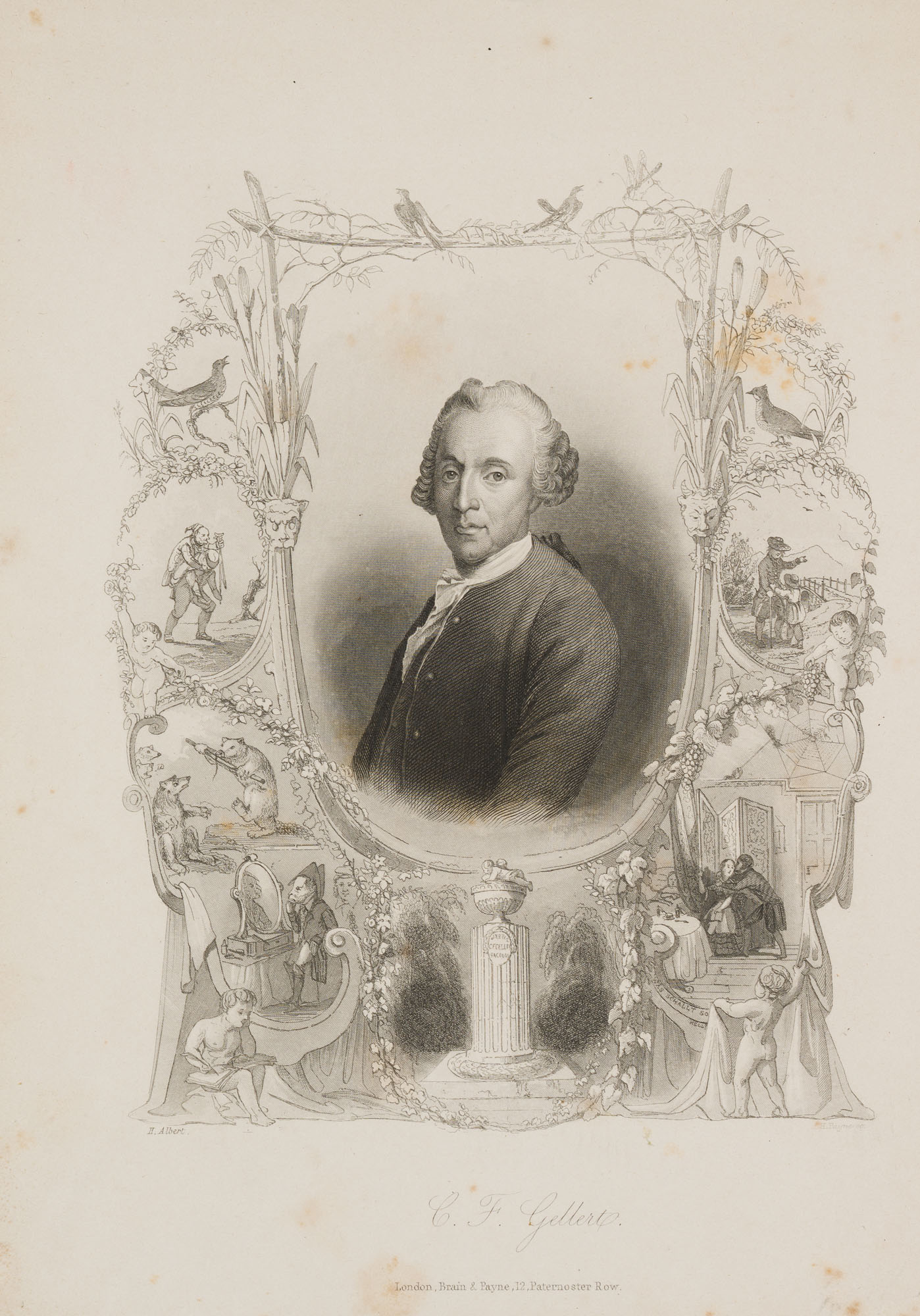 Albert Henry Payne (1812 London – 1902 Leipzig) nach Heinrich Albert (um 1766 Dresden – 1820 ), Christian Fürchtegott Gellert, Porträt des Dichters mit rahmenden literarischen Szenen, 19. Jahrhundert, Stahlstich