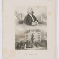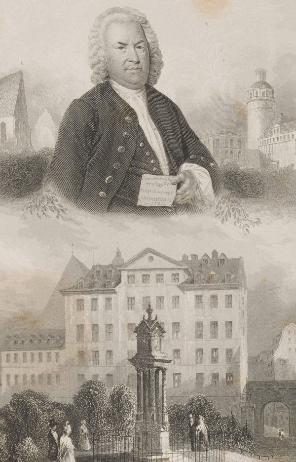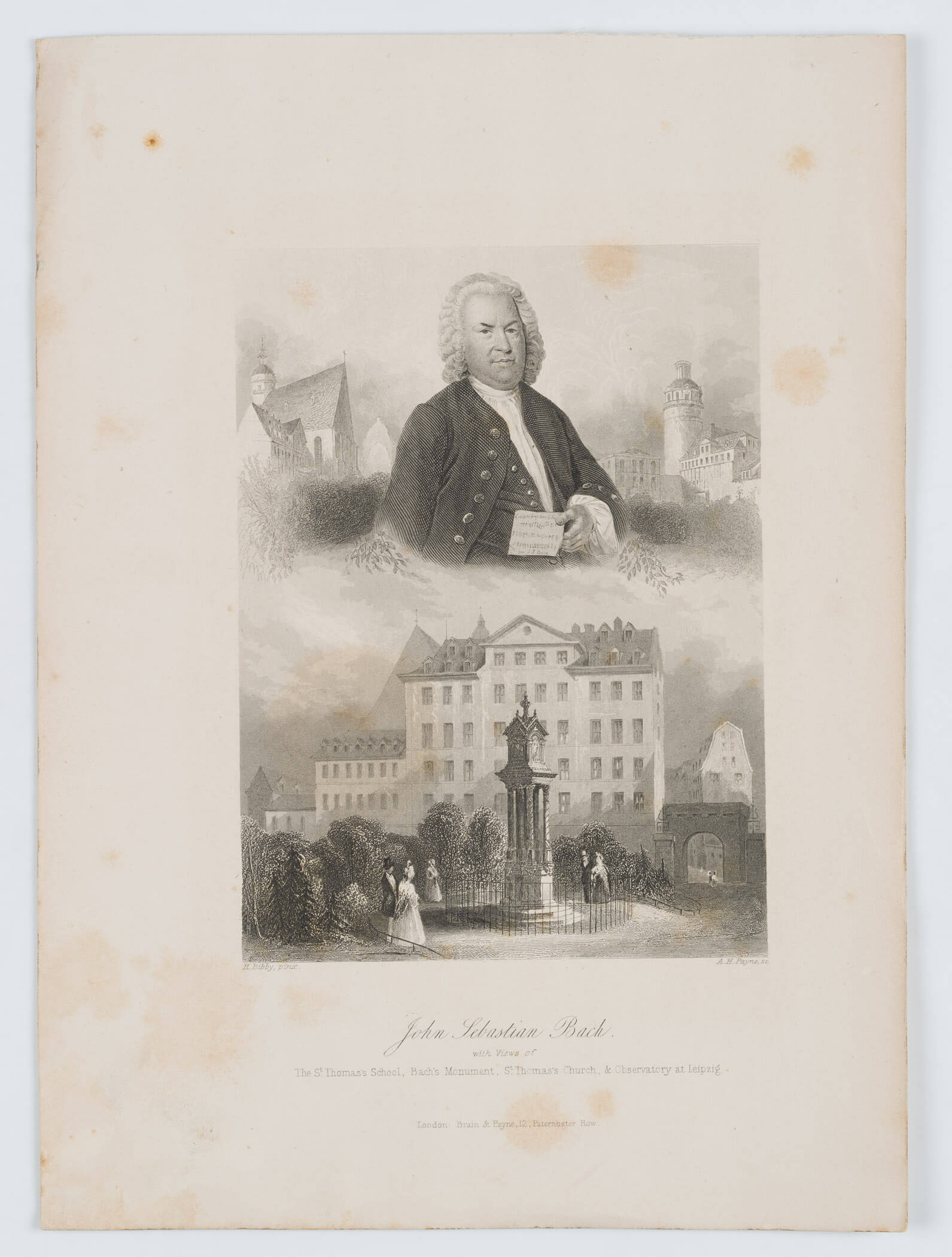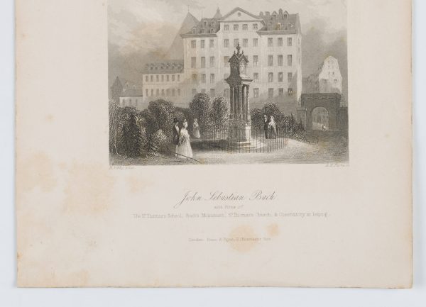 - Bezeichnung: Unten mittig im Druck signiert: “H. Bibby pinx | A. H. Payne sc.”. Unten mittig im Druck bezeichnet: “John Sebastian Bach with Views of The St. Thomas School, Bach’s monument, St. Thomas Church, & Observatory at Leipzig”.
