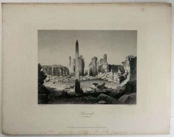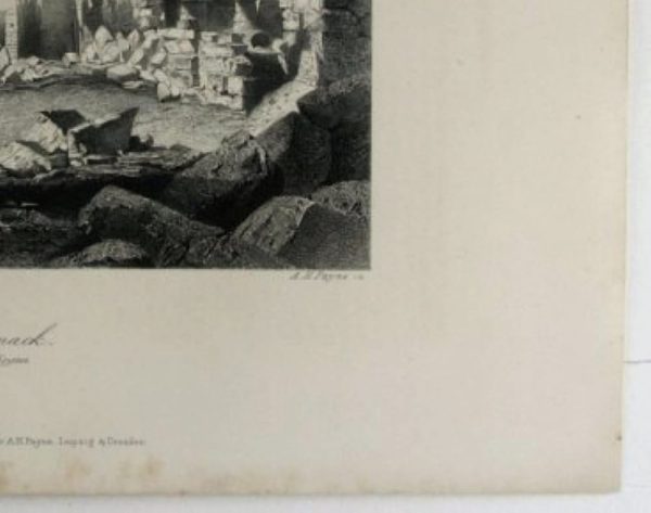 - Beschreibung: Albert Heinrich Payne, Karnack in Ägypten, Stahlstich nach A. Geyer, um 1880. Beschreibung: Stahlstich von Albert Heinrich Payne, bezeichnet: “A. Geyer pinx. Karnack in Ober-Egypten Verag d. Englischen Kunstanstalt v. A. H. Payne, Leipzig&Dresden”. Pittoreske Ansicht eines Obelisken (vermutlich der Obelisk des Hatschepsuts) in den Ruinen der Karnak-Tempel. Diese Tempelanlage ist die größte Ägyptens und liegt in der Nähe Luxors am östlichen Nilufer. Albert Heinrich Payne (London 1812 – Leipzig 1902) war Stahl- und Kupferstecher, Radierer, Maler und Illustrator. Ab 1838 war Payne Verleger in Leipzig und Dresden. Um 1850 gab er die “Dresdner Gemäldegalerie. Alte Meister” mit 126 Stahlstichen heraus.