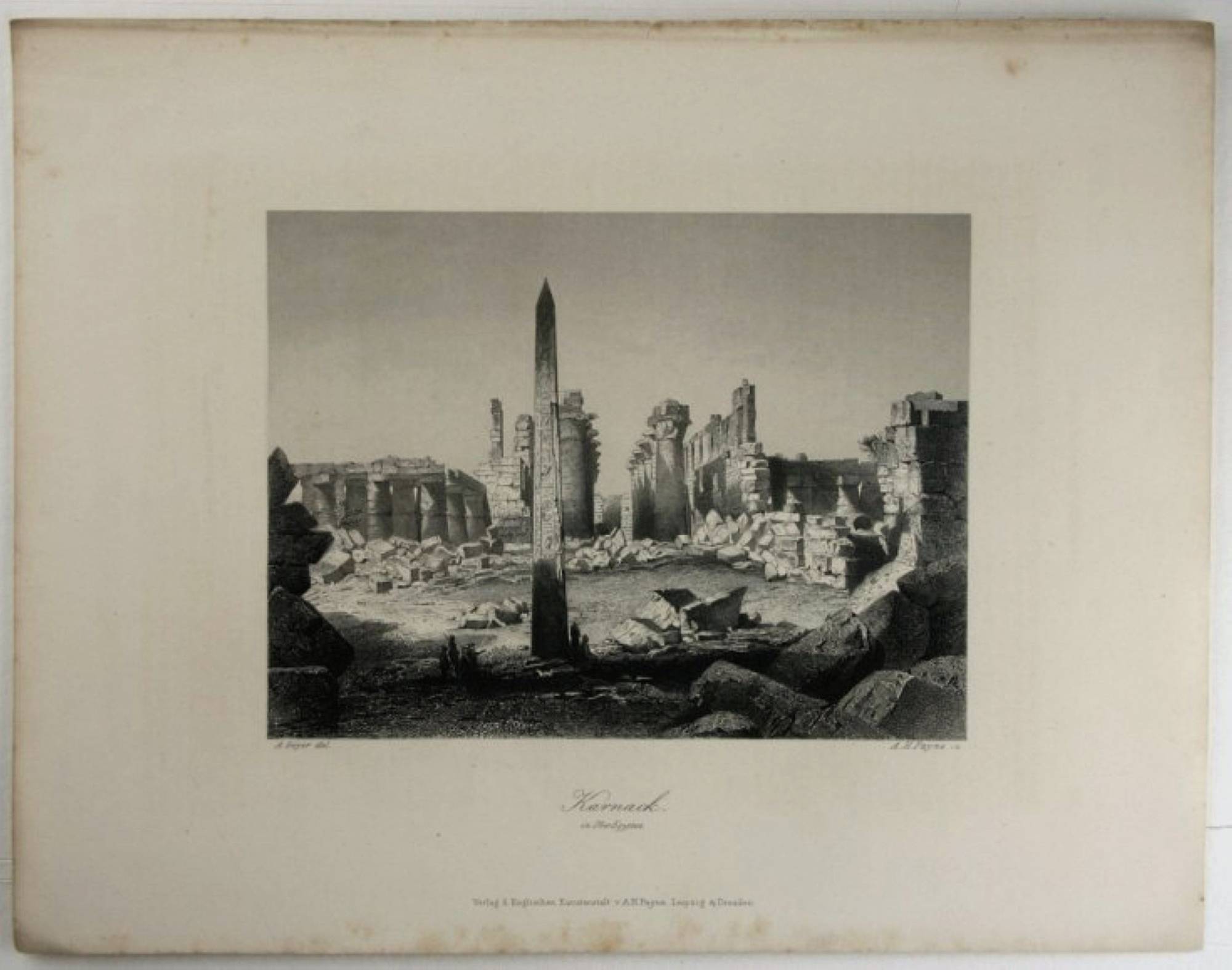 - Description: Albert Heinrich Payne, Karnack in Ägypten, steel engraving after A. Geyer, c. 1880. Description: Steel engraving by Albert Heinrich Payne, inscribed: “A. Geyer pinx. Karnack in Ober-Egypten Verag d. Englische Kunstanstalt v. A. H. Payne, Leipzig&Dresden”. Picturesque view of an obelisk (probably the obelisk of Hatshepsut) in the ruins of the Karnak temples. This temple complex is the largest in Egypt and is located near Luxor on the eastern bank of the Nile. Albert Heinrich Payne (London 1812 – Leipzig 1902) was a steel and copper engraver, etcher, painter and illustrator. From 1838 Payne was a publisher in Leipzig and Dresden. Around 1850 he published the “Dresdner Gemäldegalerie. Old Masters” with 126 steel engravings.