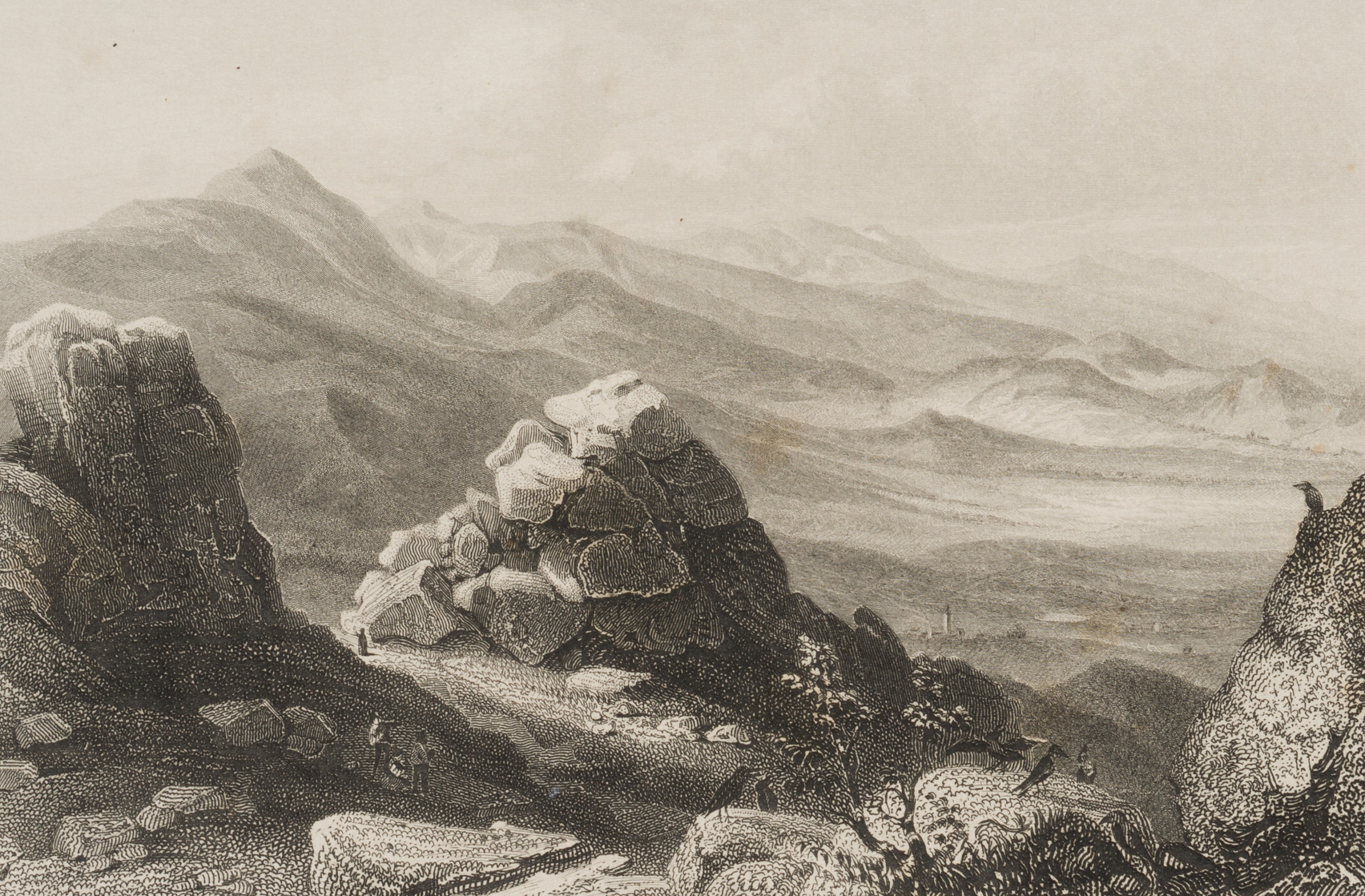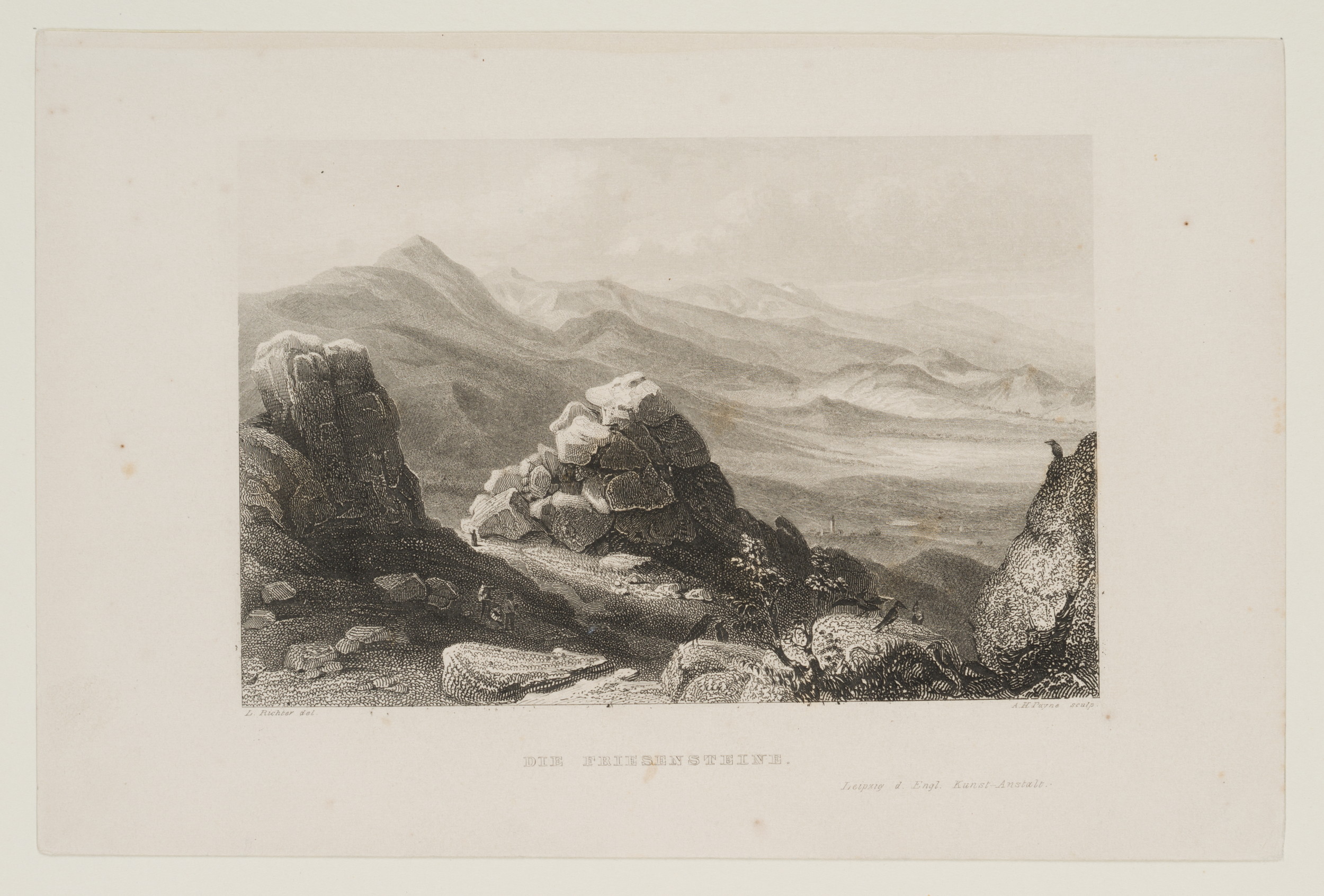 Albert Henry Payne (1812 London – 1902 Leipzig) nach Ludwig Richter (1803 Dresden – 1884 ebd.), Die Friesensteine. Panoramaausblick über das Schmiedeberger Tal. Riesengebirge, 19. Jahrhundert, Stahlstich
