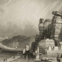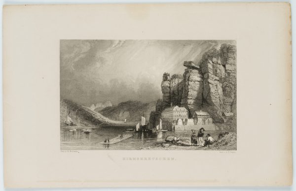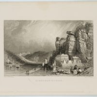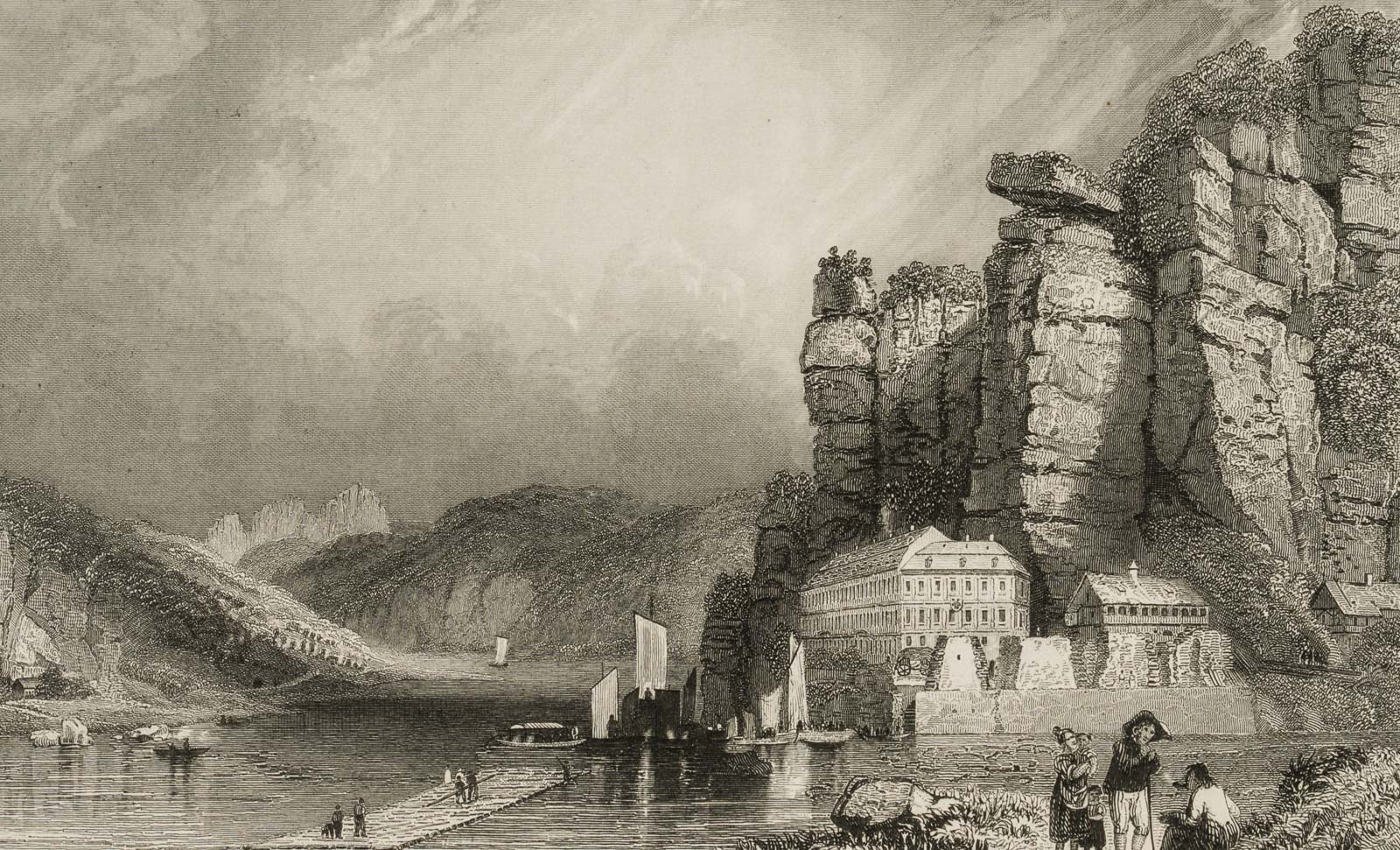 - Description: The print shows the impressive natural scenery with monumental sandstone rock gorge near Hernskretschen, Bohemian Switzerland.