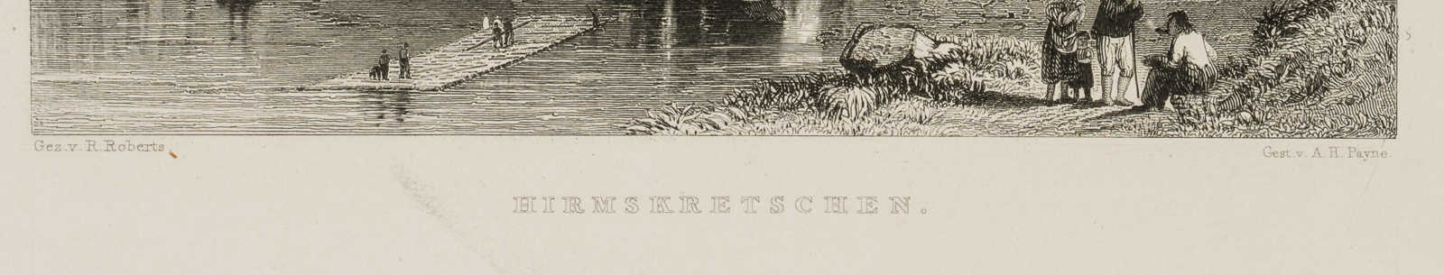 - Bezeichnung: Links unterhalb der Graphik signiert mit “Gez. v. R. Roberts” und rechts mit “Gest. v. A. H. Payne.”. Darunter beschriftet mit “HIRMSKRETSCHEN.”.