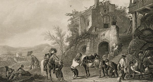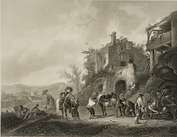 Albert Henry Payne (1812 London – 1902 Leipzig) after Philips Wouwerman (1619 Haarlem – 1668 ibid.), Lively genre scene with working blacksmiths in front of a ruined forge, 19th century, Steel engraving