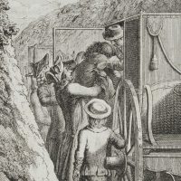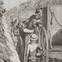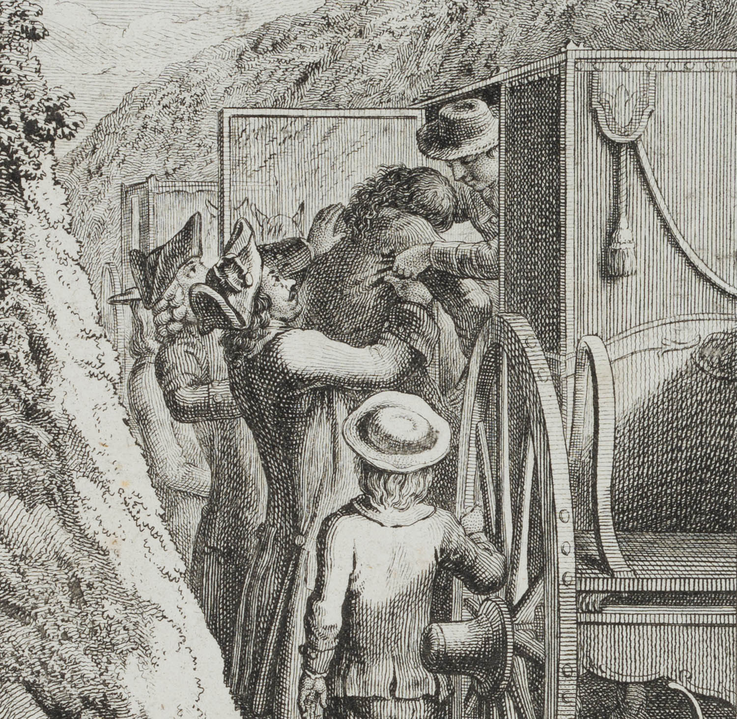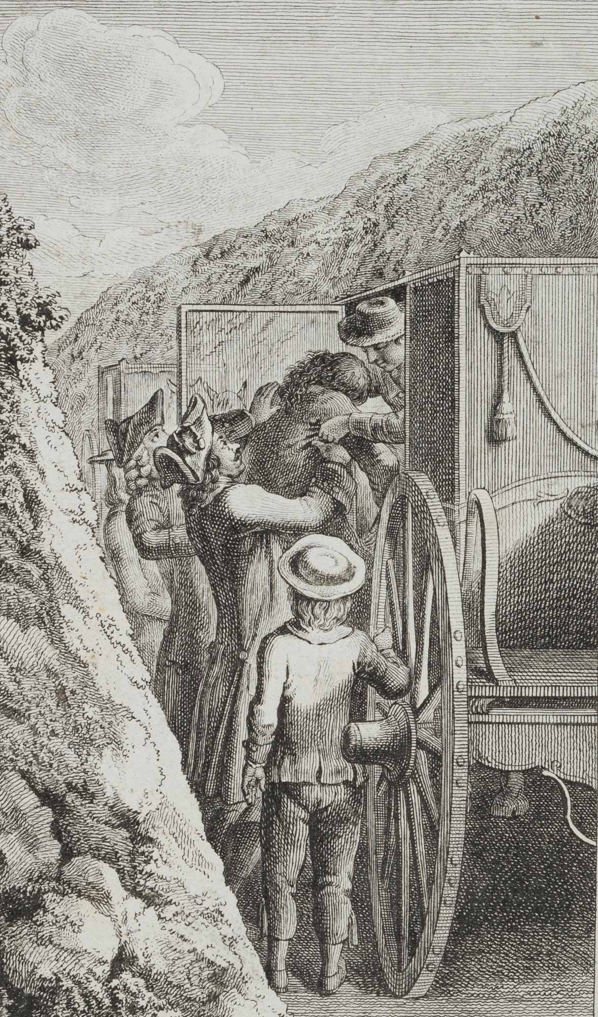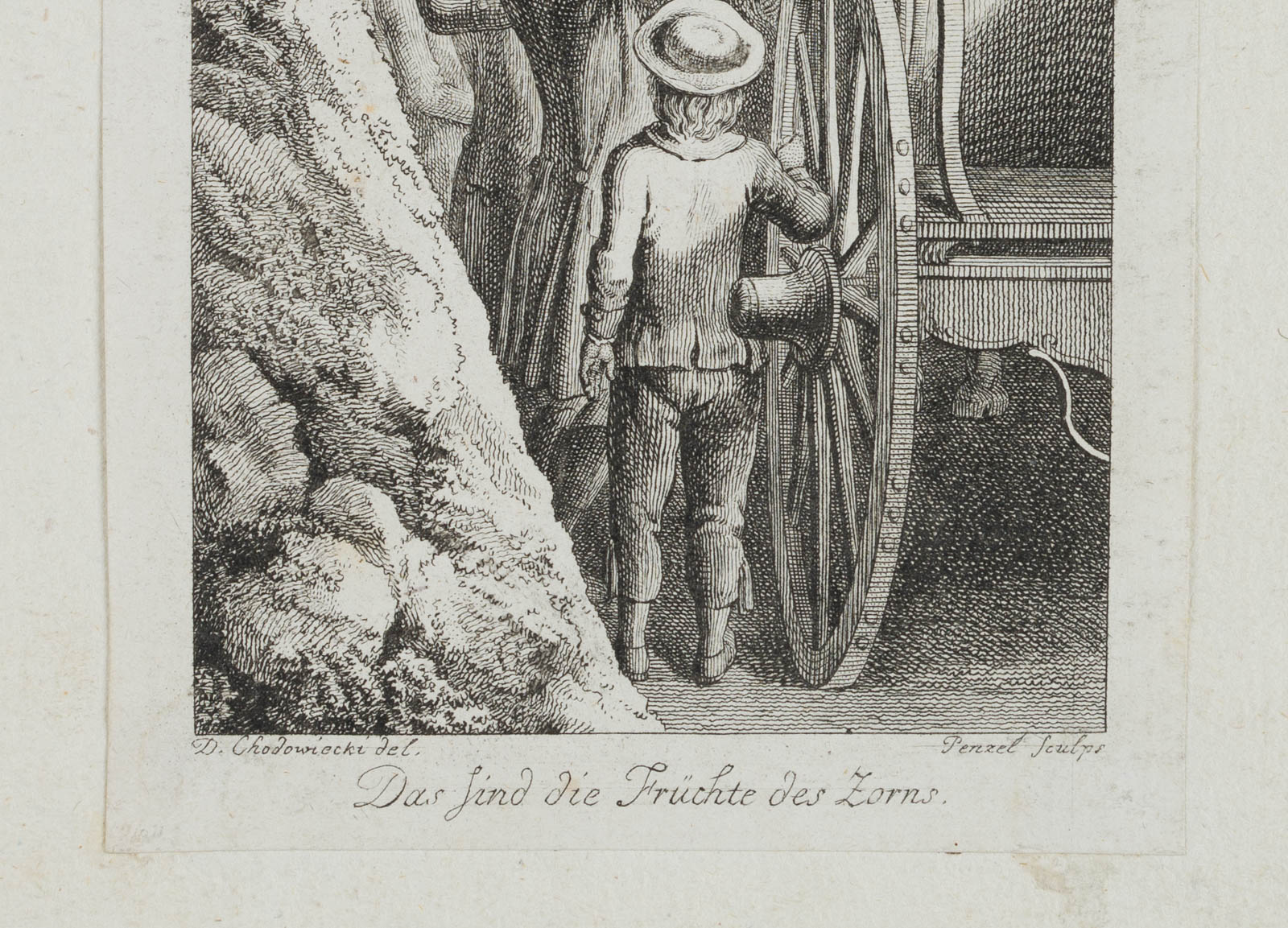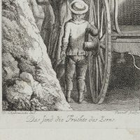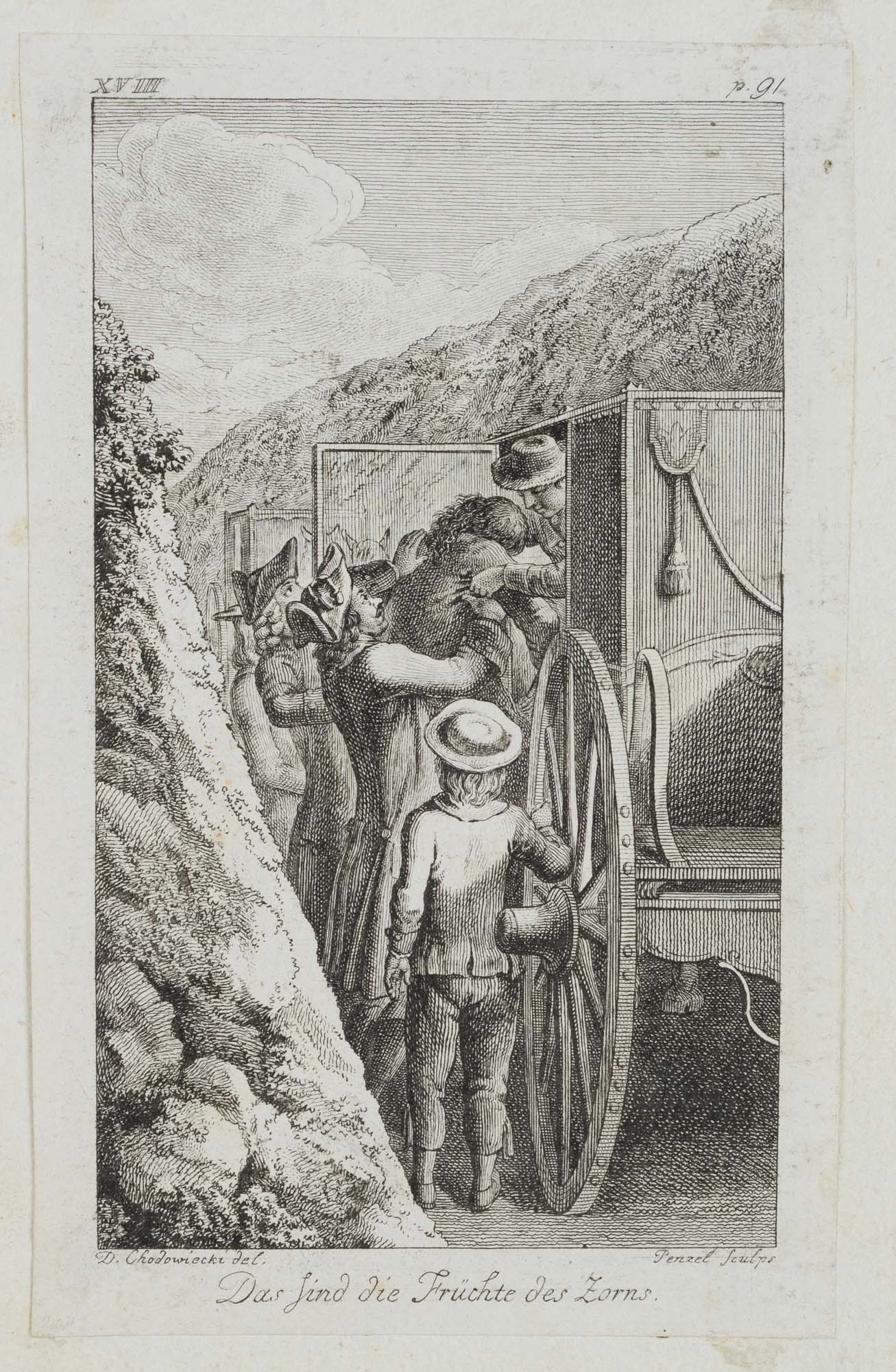 Johann Georg Penzel (1754 Hersbruck – 1809 Leipzig) nach Daniel Nikolaus Chodowiecki (1726 Danzig – 1801 Berlin), ‘Das sind die Früchte des Zorns’, Männer einen Bewusstlosen in die Kutsche tragend, 18. Jahrhundert, Kupferstich