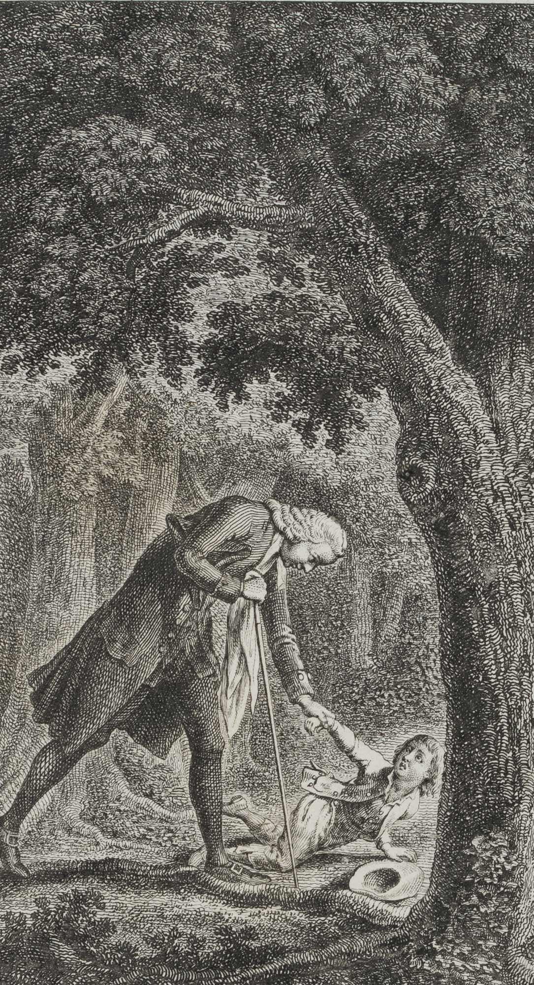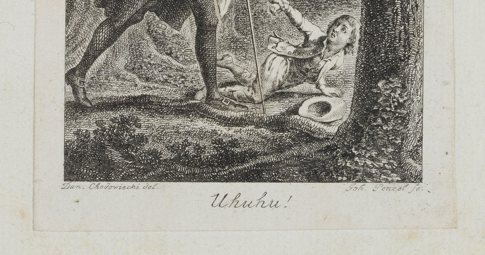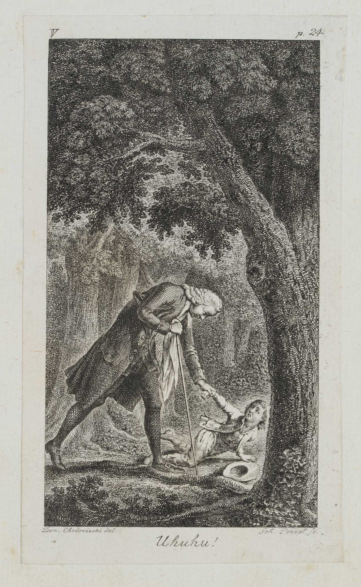 Johann Georg Penzel (1754 Hersbruck – 1809 Leipzig) nach Daniel Nikolaus Chodowiecki (1726 Danzig – 1801 Berlin), ‘Uhuhu’, Mann im Wald einem Jungen nachstellend, 18. Jahrhundert, Kupferstich