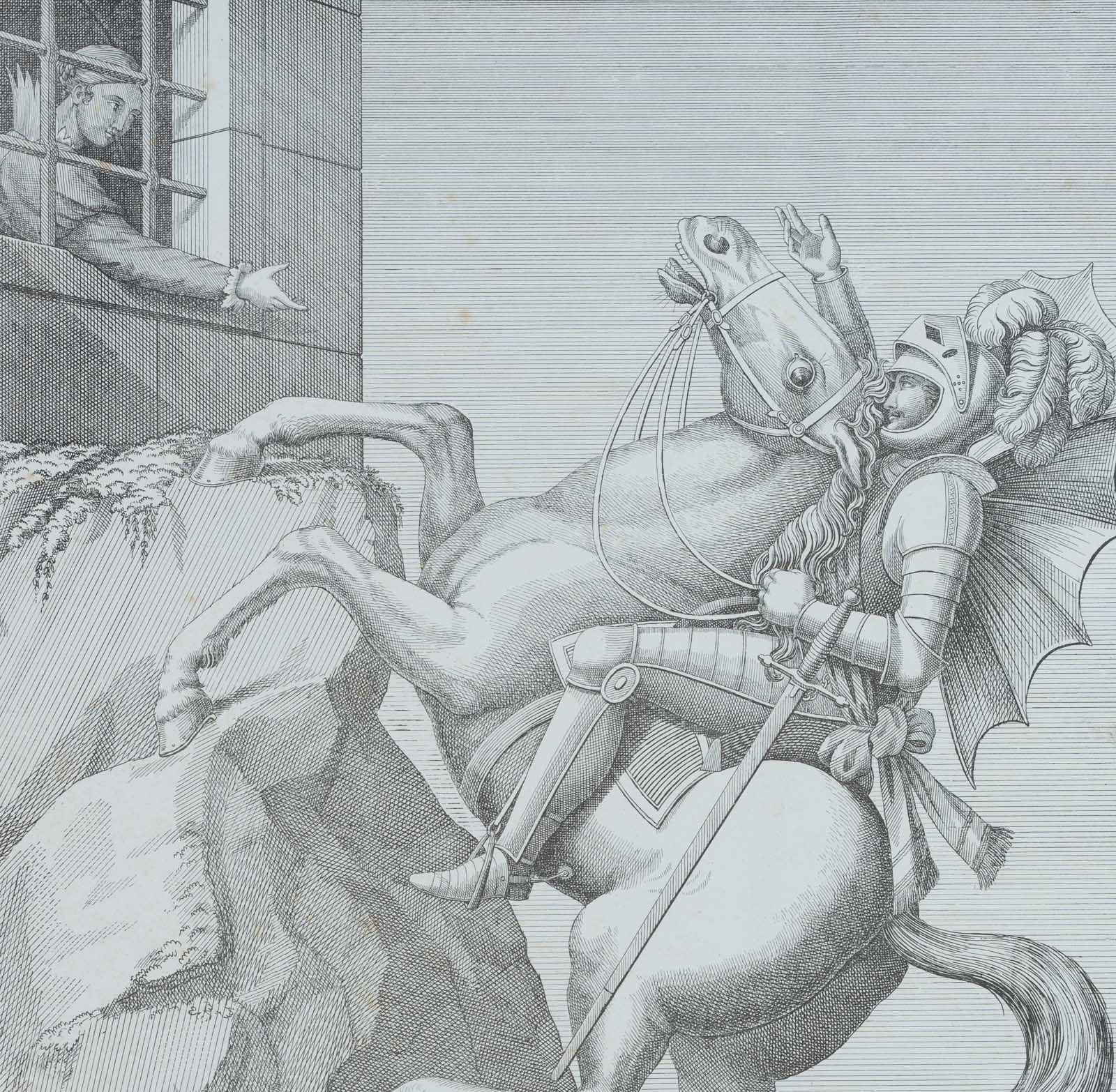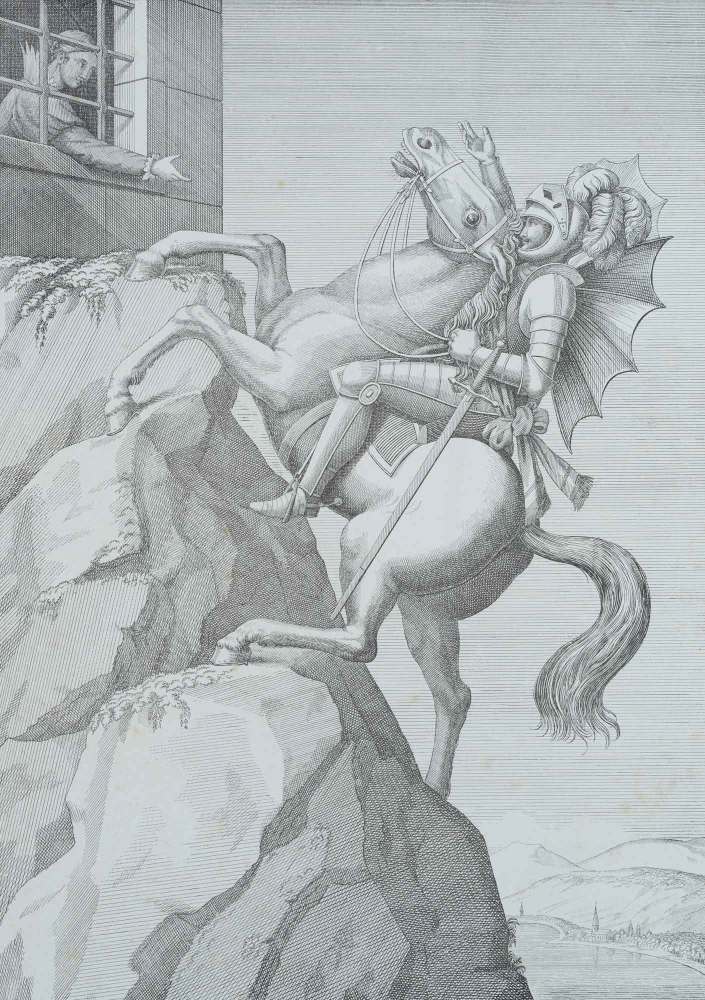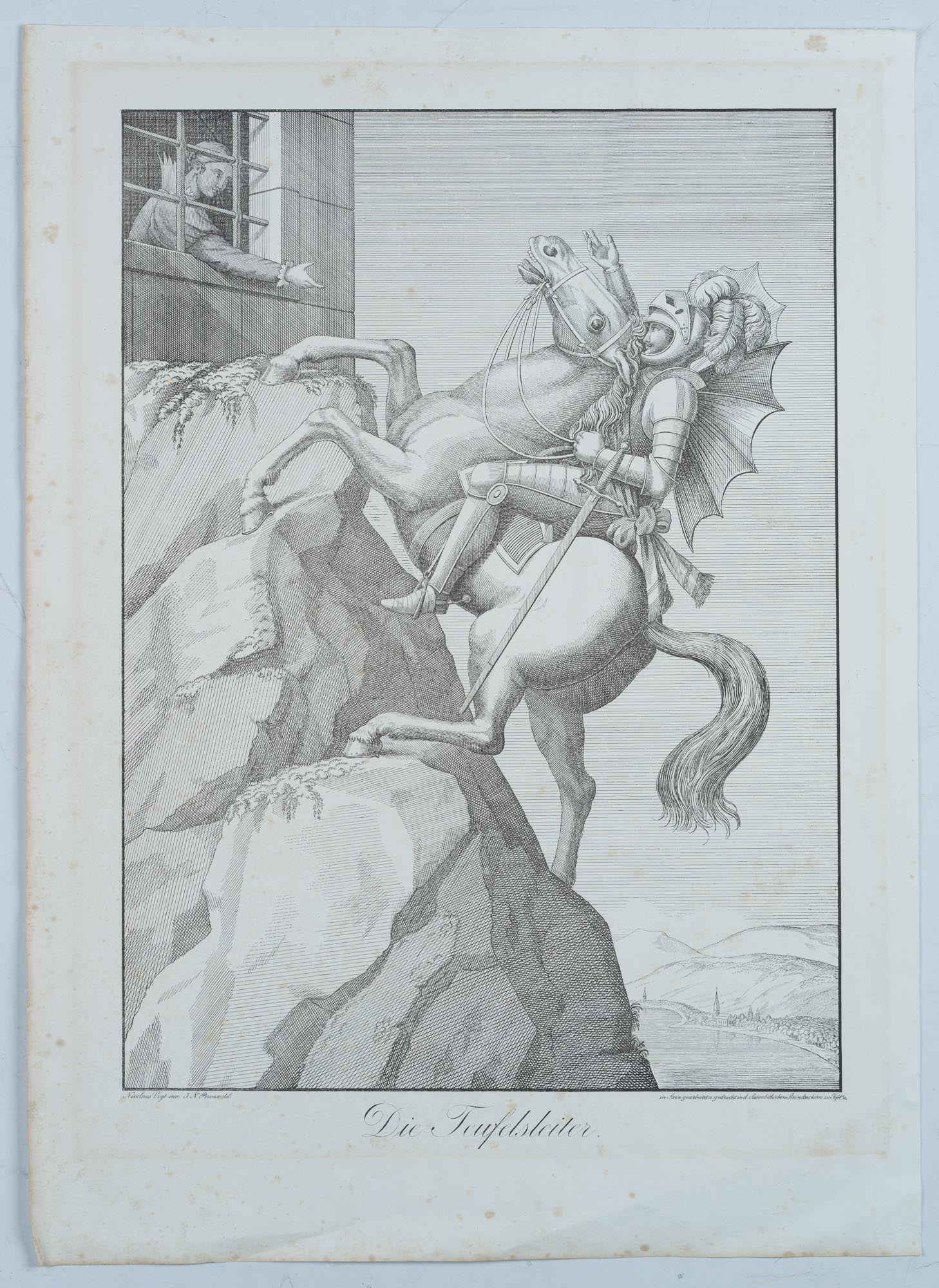 • Beschreibung: Blatt aus dem Buch ‘Rheinische Bilder’, das von deutschen Sagen erzählt und diese illustriert, herausgegeben von Nicolaus Vogt, 1821 im Verlag der Hermannschen Buchhandlung erschienen. Die Darstellung illustriert die Sage der Teufelsleiter bei Lorch und zeigt den Ritter, der die Teufelsleiter erklimmt, um die gefangene schöne Tochter des Ritter Sibo zu retten.