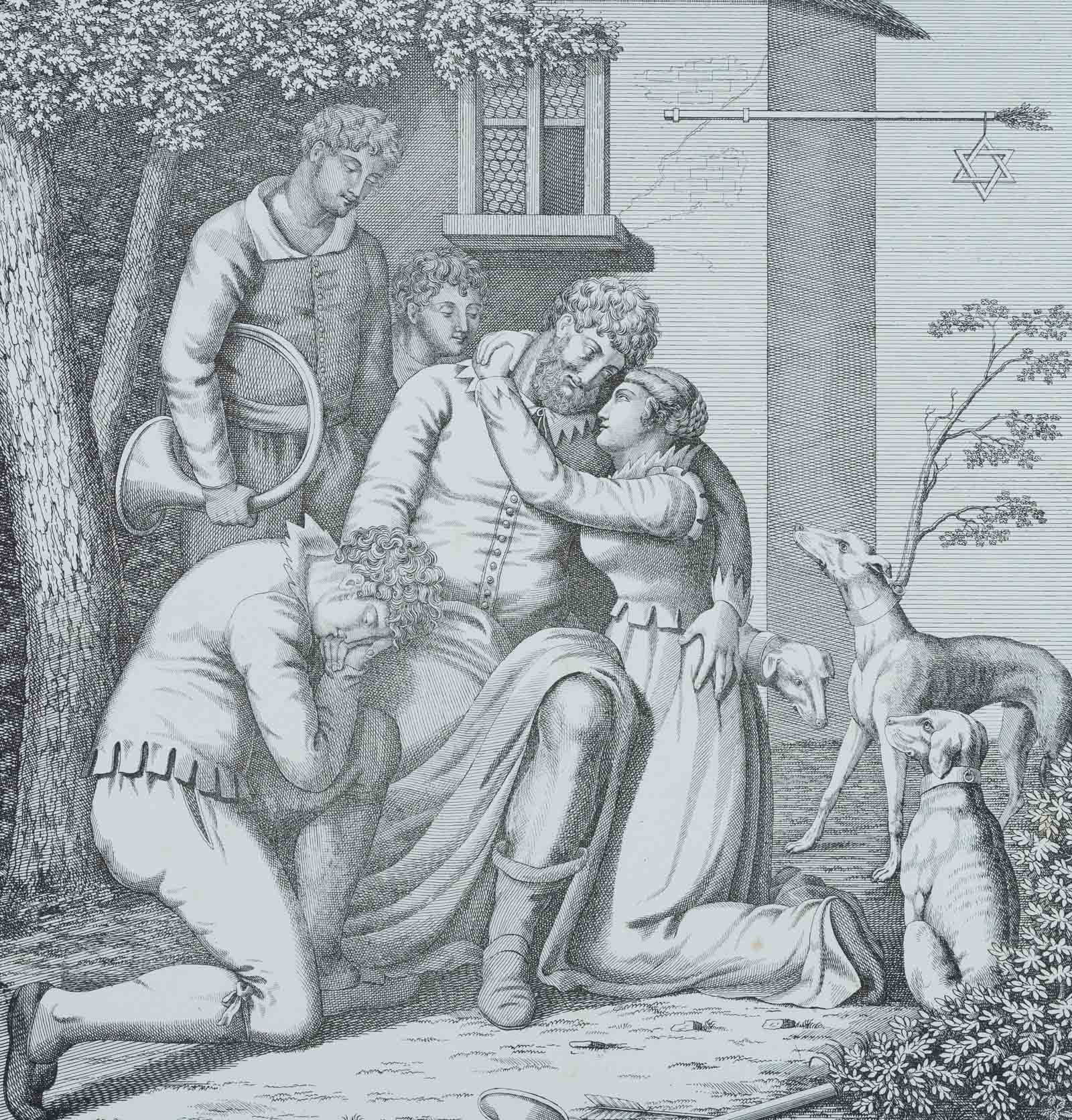 - Beschreibung: Blatt aus dem Buch ‘Rheinische Bilder’, das von deutschen Sagen erzählt und diese illustriert, herausgegeben von Nicolaus Vogt, 1821 im Verlag der Hermannschen Buchhandlung erschienen. Die Darstellung zeigt Kaiser Karl, der seine Tochter Emma (auch Imma), nachdem er sie und ihren Geliebten Einhard (auch Eginhart) verbannt hatte, in Seligenstadt wiedersieht.