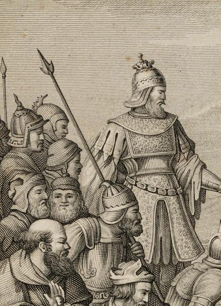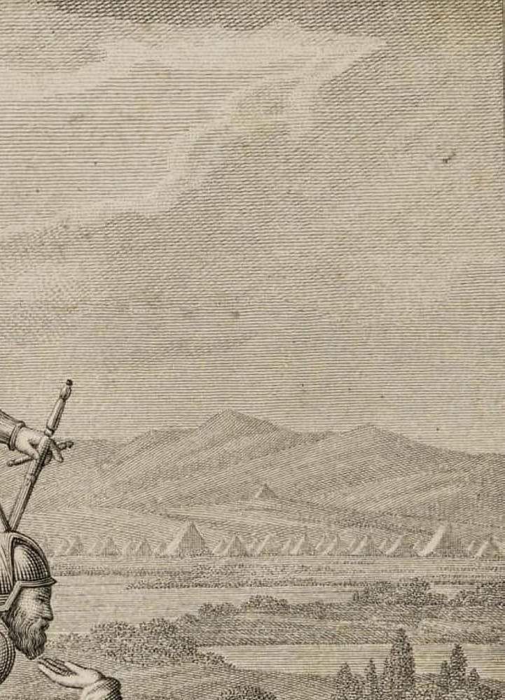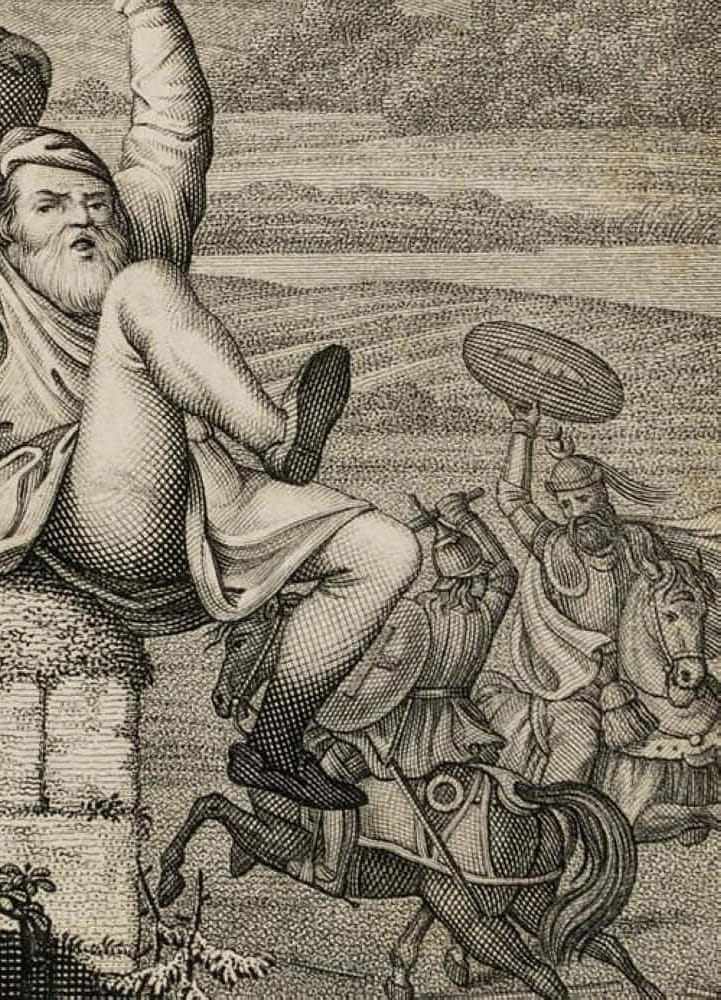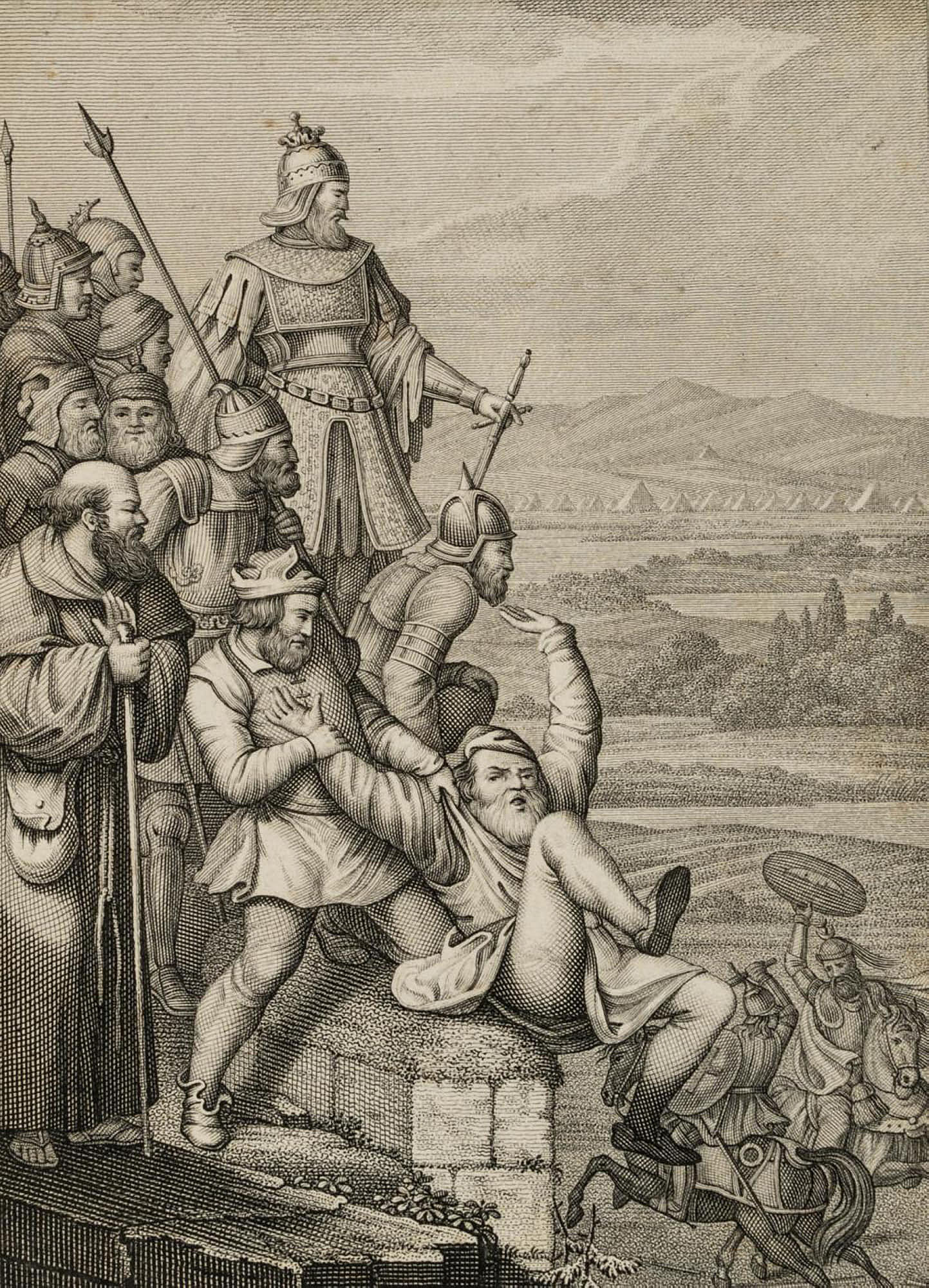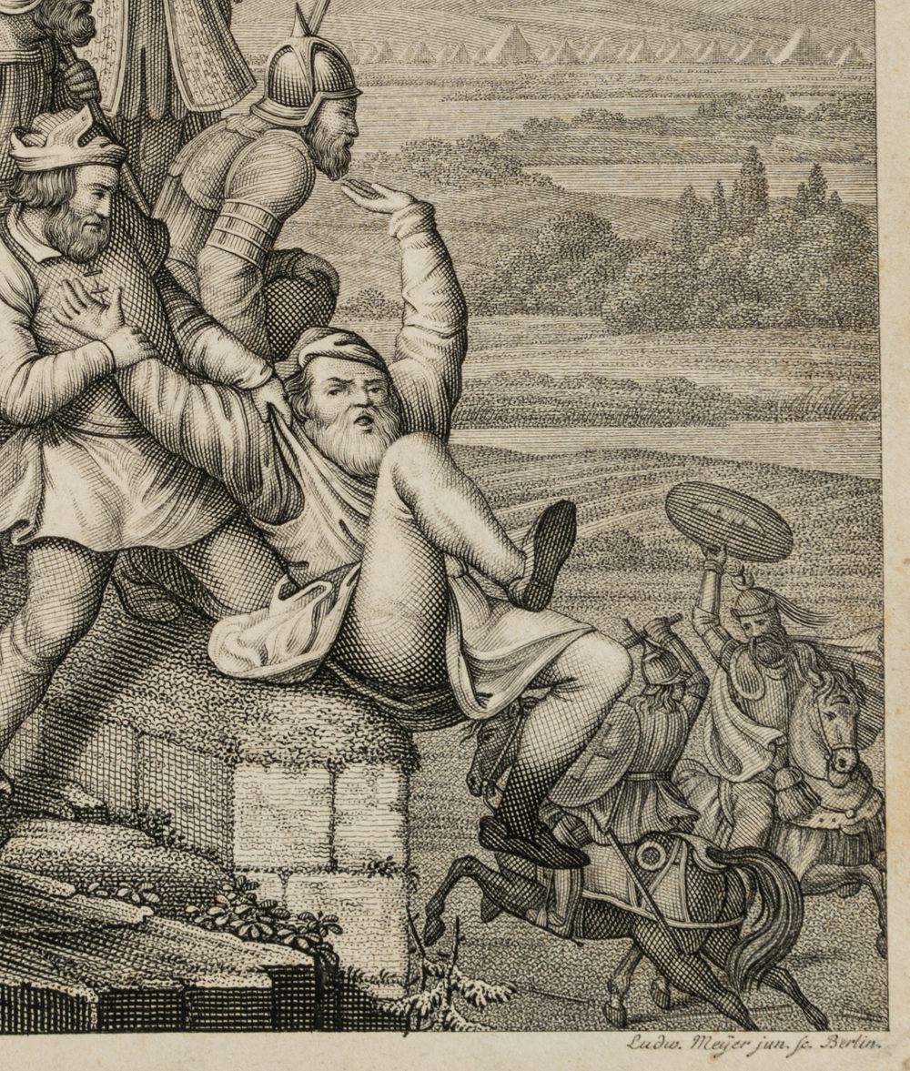 - Description: Miniaturised scene, probably the illustration of a literary work of the Enlightenment or Romantic period. Showing a courtly society with king, knights and a monk standing on a wall and observing a duel on horseback between a crusader and a Saracen. In the centre, a man depicted in peasant dress falls from the wall.