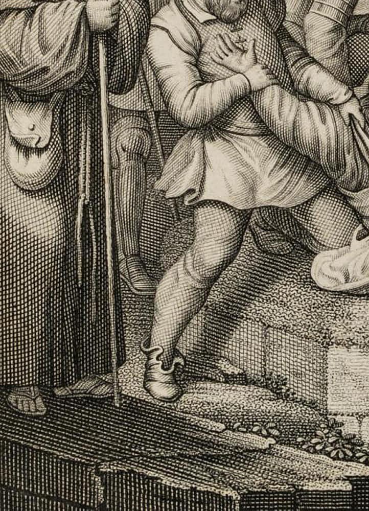 - Beschreibung: Miniaturisierte Szene, vermutlich die Illustration eines literarischen Werkes der Aufklärung oder der Romantik. Zeigt eine höfische Gesellschaft mit König, Rittern und einem Mönch auf einer Mauer stehend und einen Zweikampf zu Pferd zwischen einem Kreuzritter und einem Sarazenen beobachtend. Mittig stürzt ein in bäuerlicher Kleidung dargestellter Mann von der Mauer.