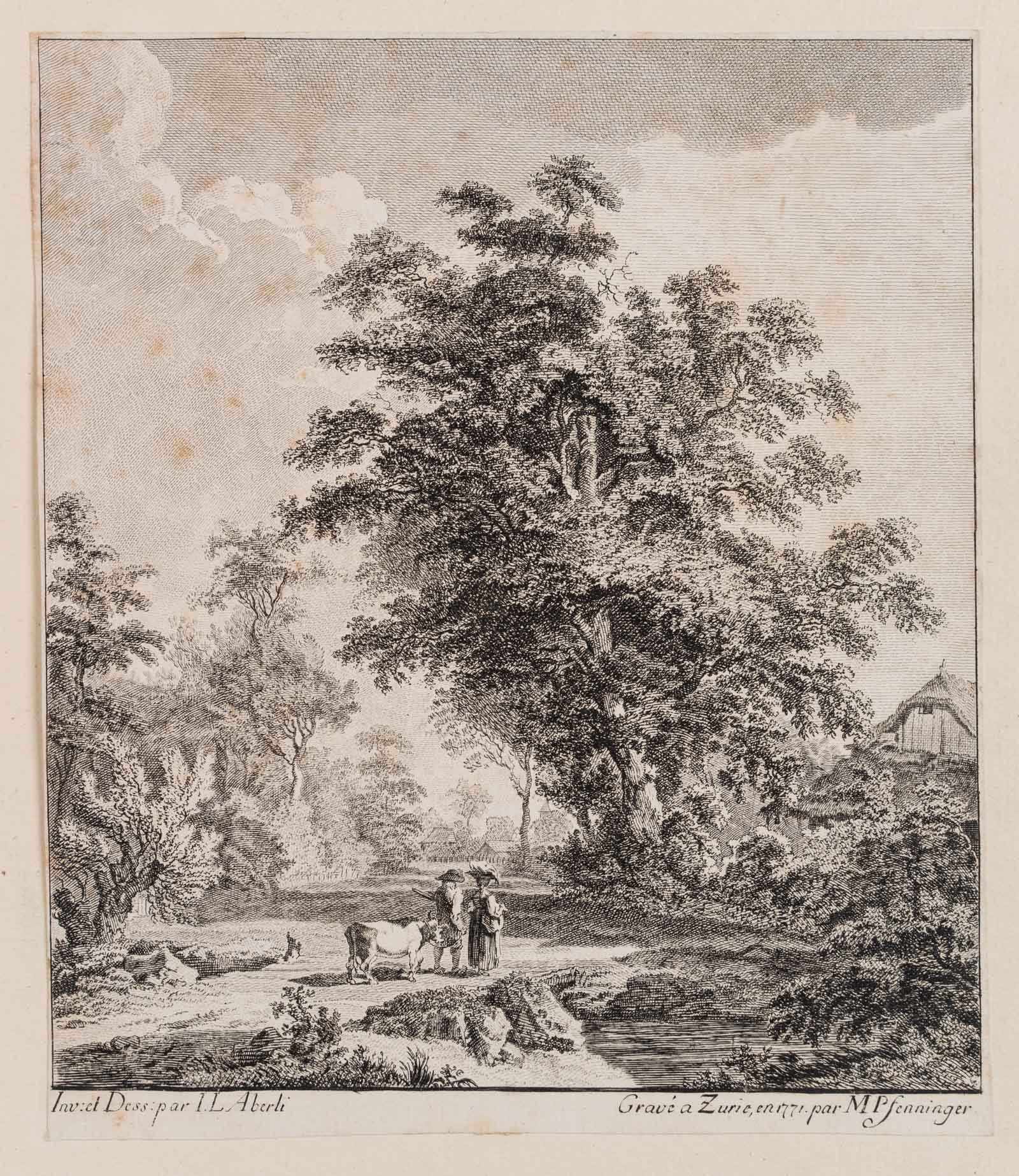 Matthias Pfenninger (1739 Zürich – 1813 ebd.) nach Johann Ludwig Aberli (1723 Winterthur – 1786 Bern), Bauernpaaar mit Kuh in Landschaft, 18. Jahrhundert, Kupferstich