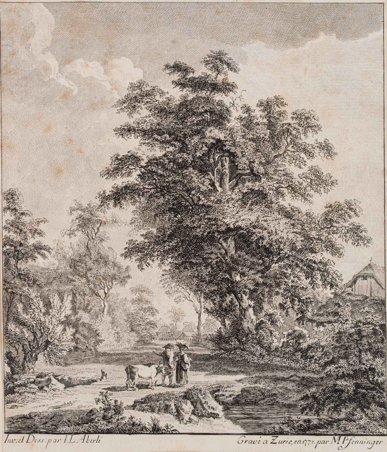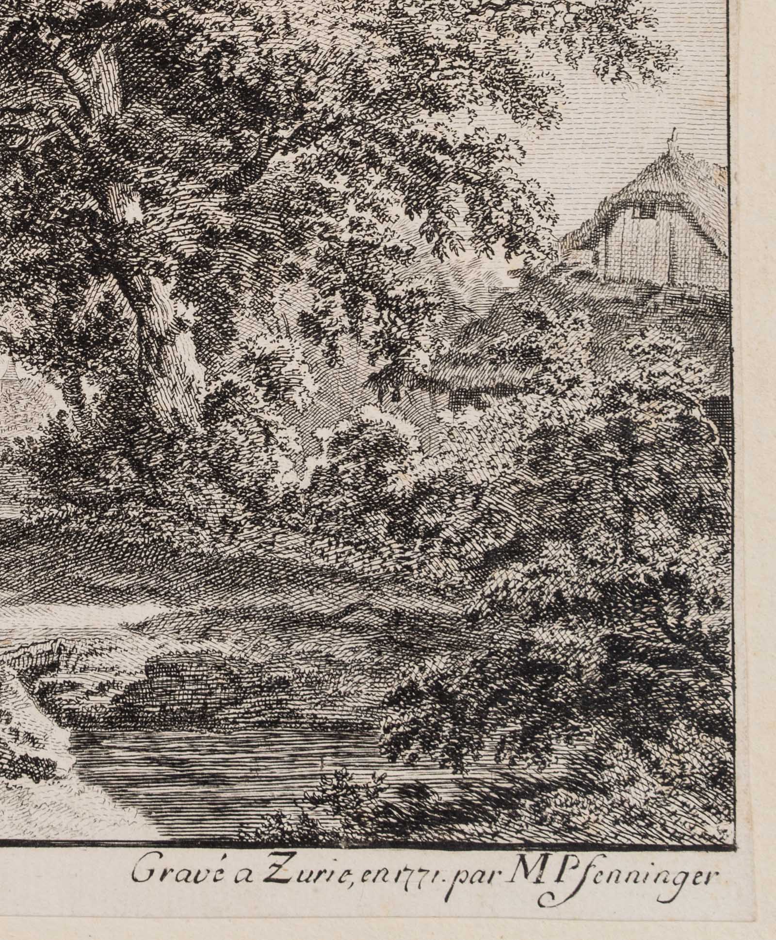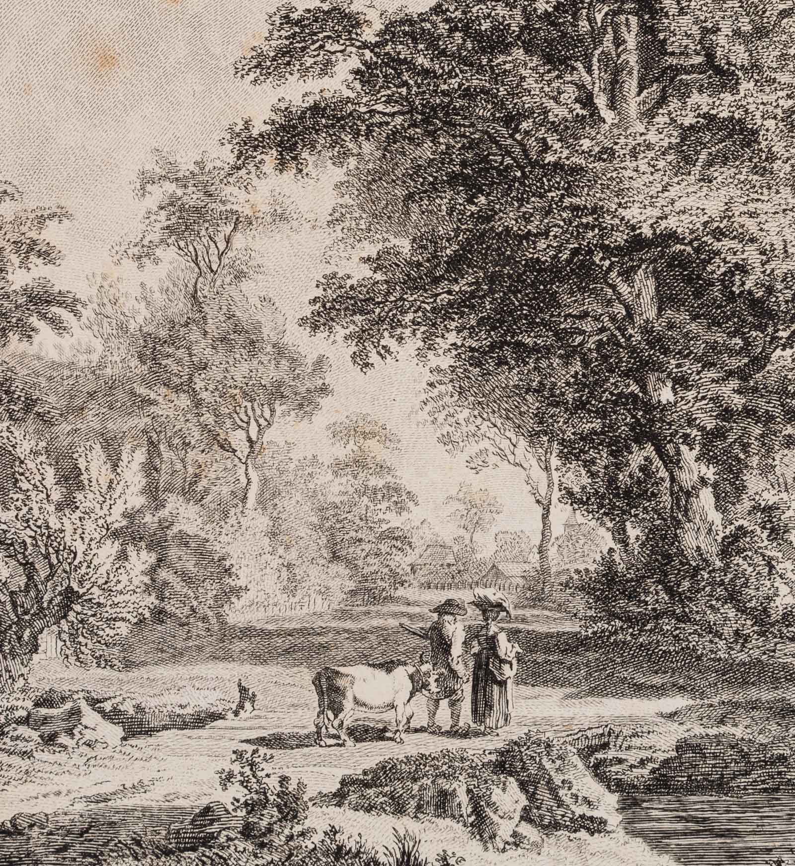 Matthias Pfenninger (1739 Zurich – 1813 ibid.) after Johann Ludwig Aberli (1723 Winterthur – 1786 Bern), Farmer couple with cow in landscape, 18th century, Copper engraving