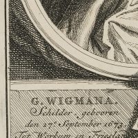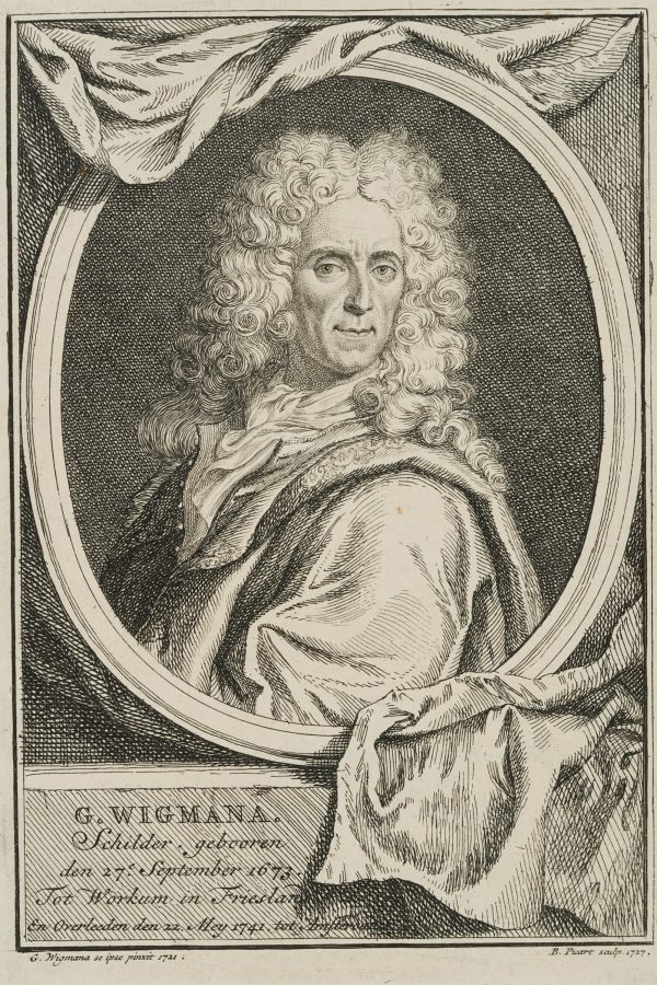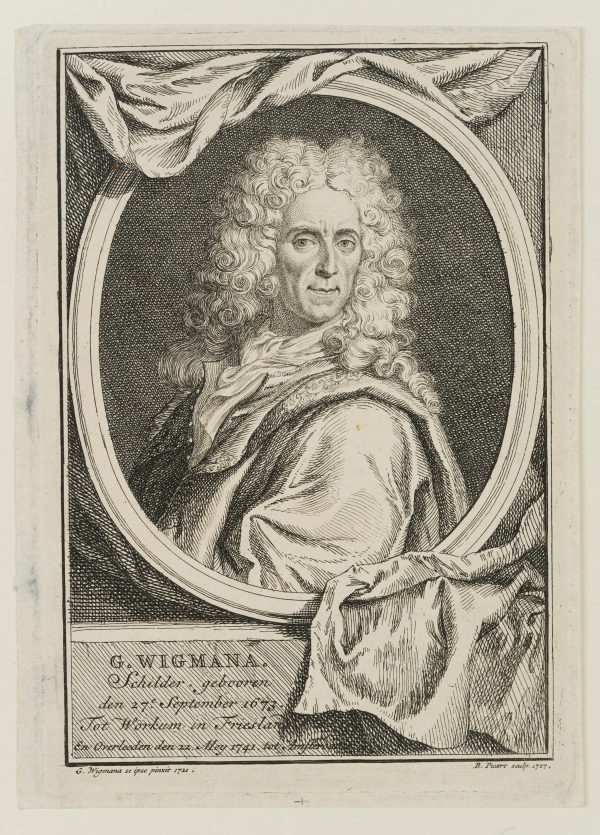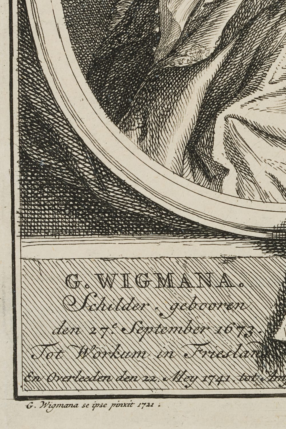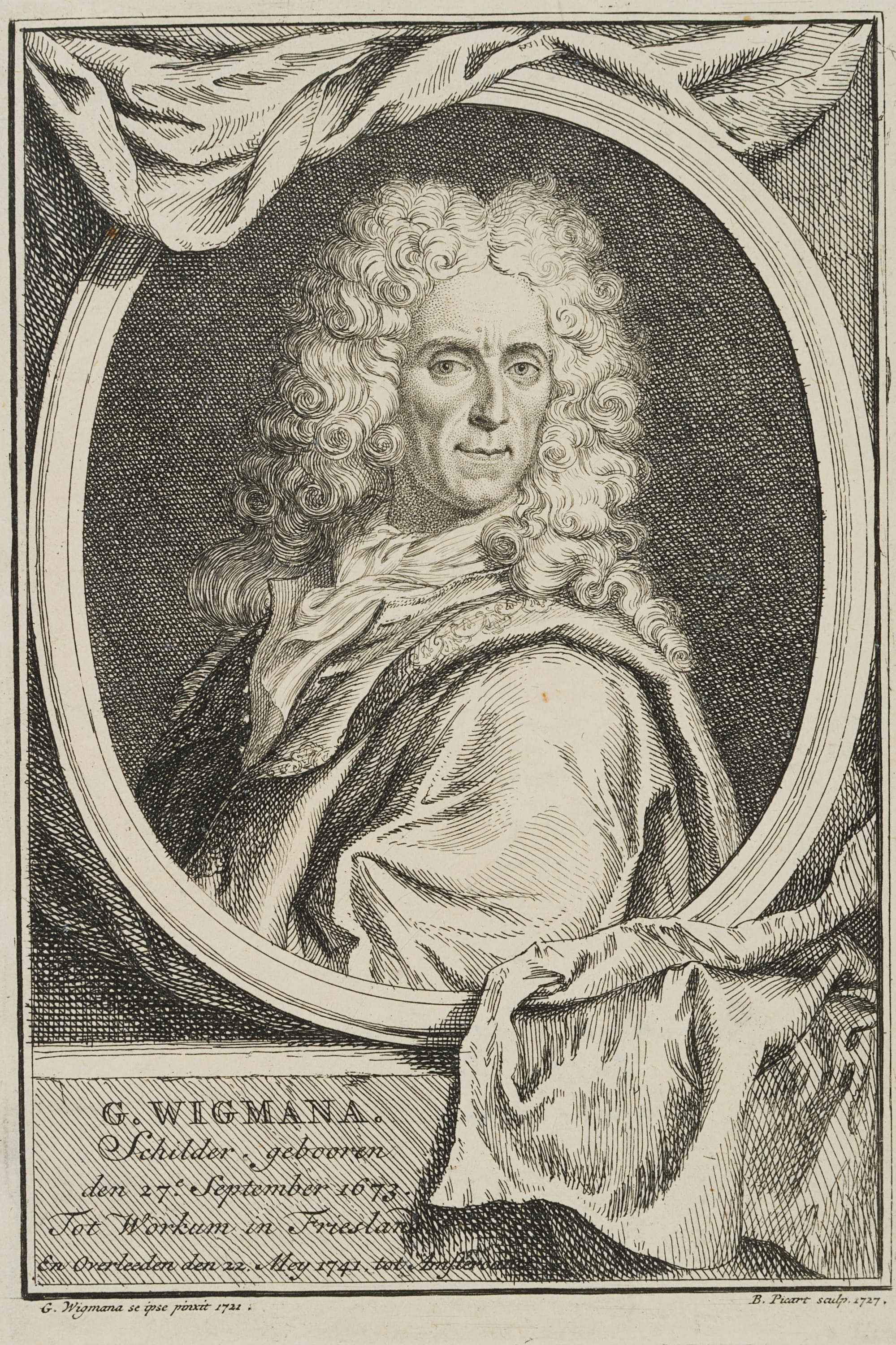 - Bezeichnung: Unten im Druck signiert: “G. Wigmana se ipse pinxit 1721 /B. Picart sculp.”. Unten rechts datiert: “1727”. Unten links im Druck bezeichnet: “G. Wigmana./Schilder. Gebooren den 27.e September 1673. Tot Workum in Friesland. En Overleeden den 22. Mey 1741 tot Amsterdam”.