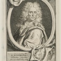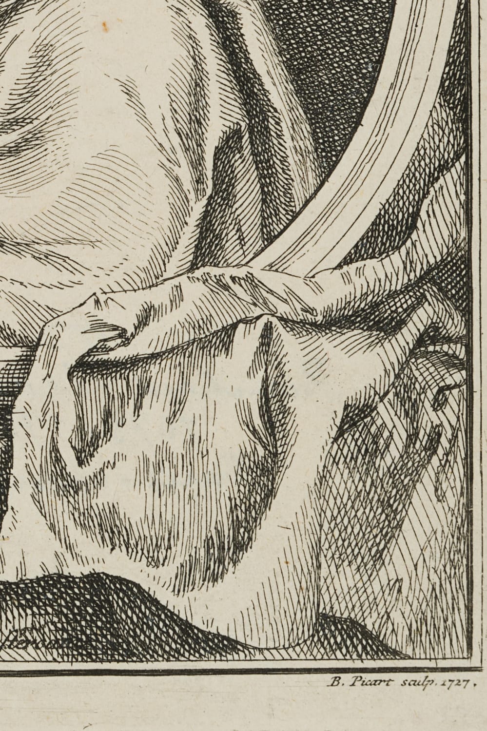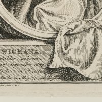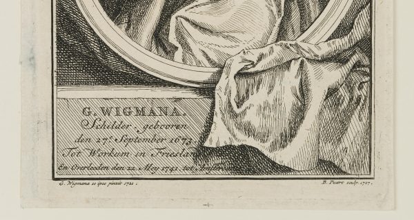 - Inscription: At the lower part signed in the printing plate: “G. Wigmana se ipse pinxit 1721 /B. Picart sculp.”. lower left inscribed in the printing plate: “G. Wigmana./Schilder. Gebooren den 27.e September 1673. Tot Workum in Friesland. En Overleeden den 22. Mey 1741 tot Amsterdam”. Lower right dated: “1727”.