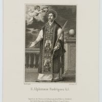 - Description: Depiction of the saint of the Spanish Jesuit Alphonsus Rodriguez (Segovia 1532 – Palma 1617) with a flying angel laying a wreath of flowers on him.