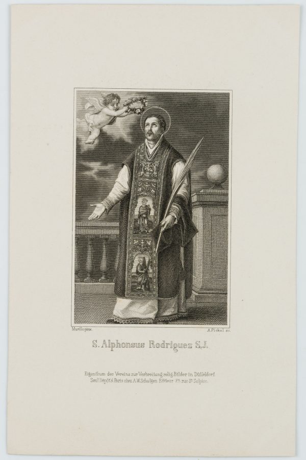 - Inscription: Signed on the left below with “Murillo pinx.” and on the right with “A. Pickel sc.”. Below the name of the saint: “S. Alphonsus Rodriguez S. J.”.
