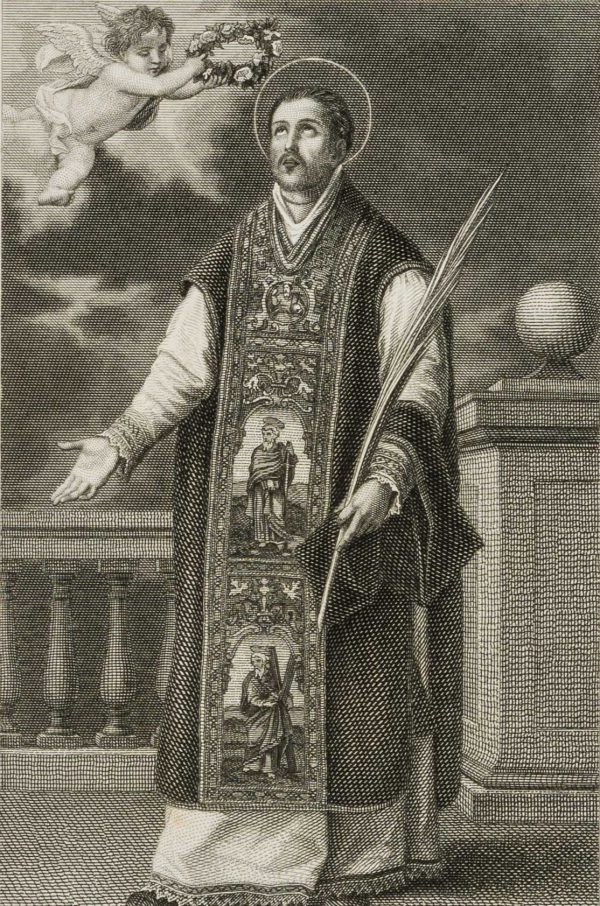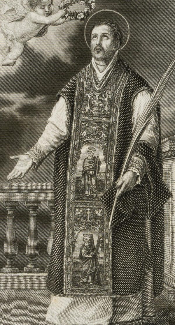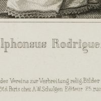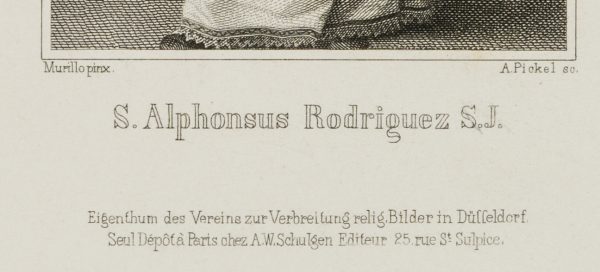 - Bezeichnung: Links darunter signiert mit “Murillo pinx.” und rechts mit “A. Pickel sc.”. Darunter der Name des Heiligen: “S. Alphonsus Rodriguez S. J.”.