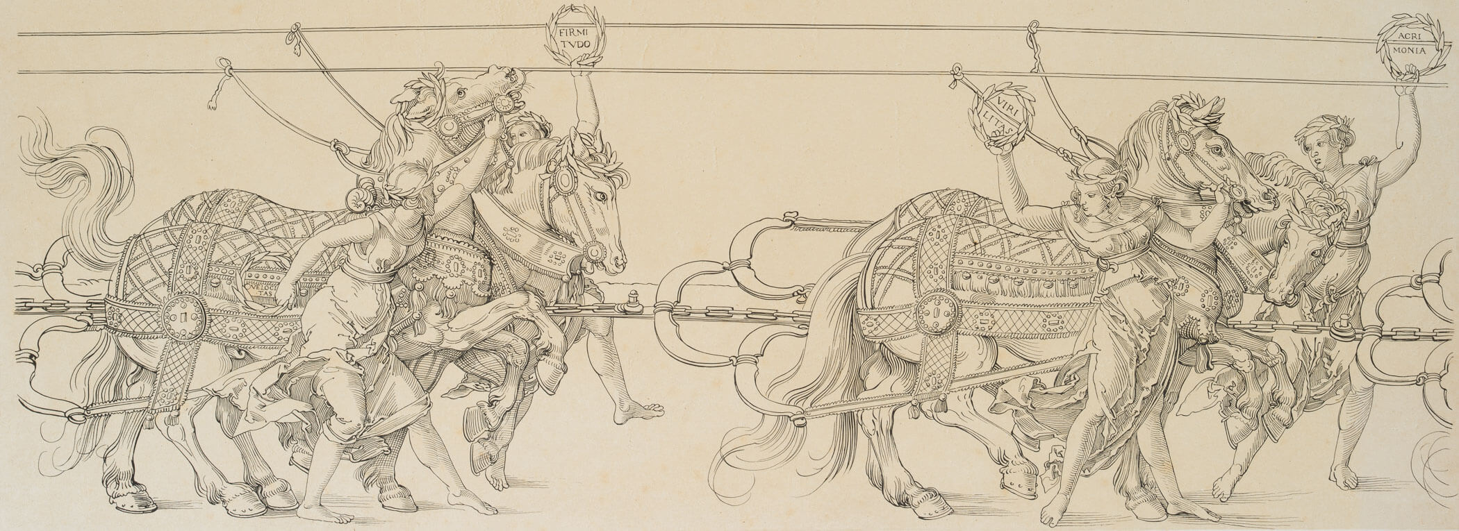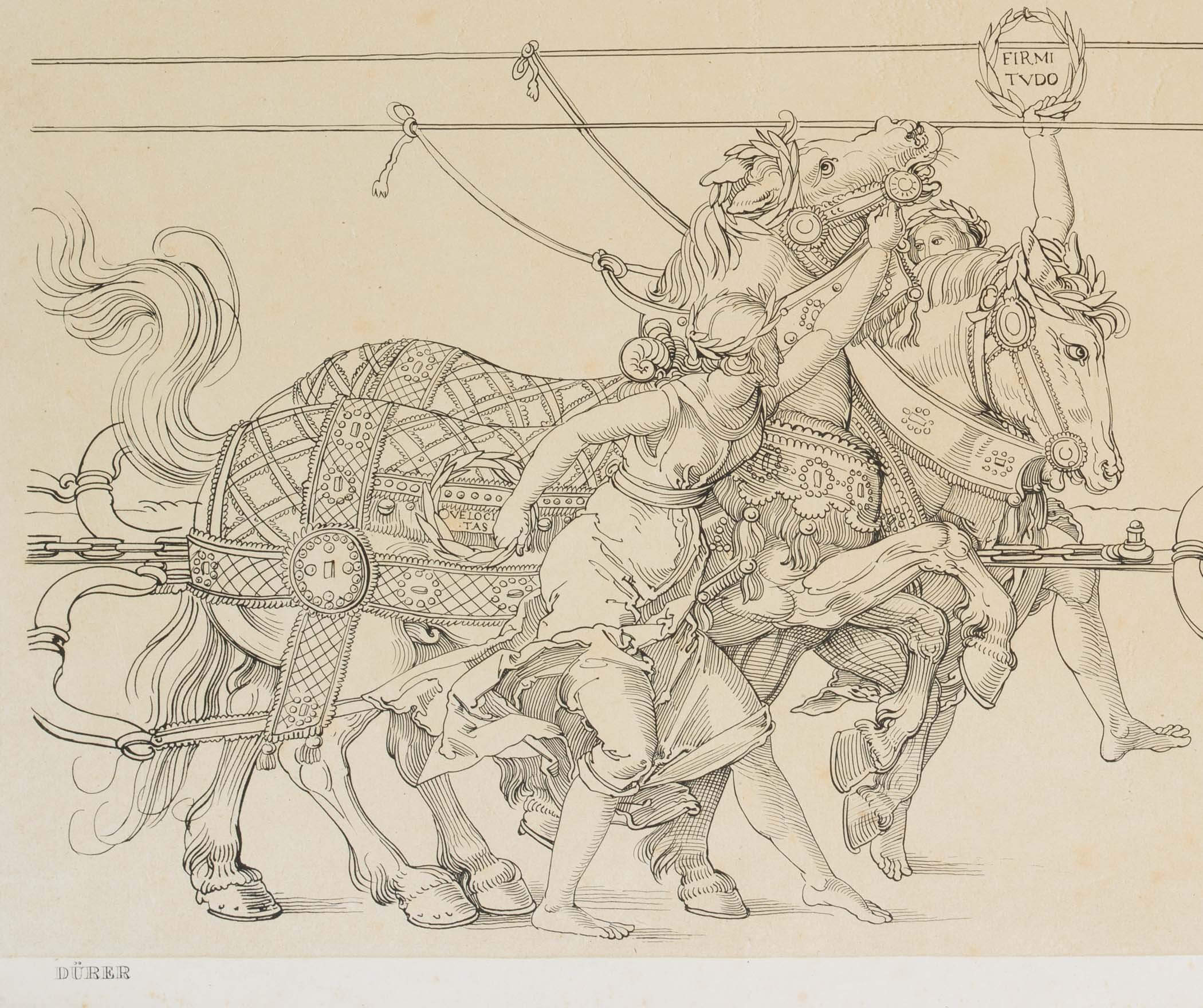 - Beschreibung: Teil der Pferde, die den Wagen des Kaiser Maximilians I. (siehe Graphik in unserem Angebot) ziehen. Dem hinteren Pferdesespann wird die Eigenschaft “Firmitudo” und dem vorderen die Eigenschaften “Viri Litas” und “Acri Monia” zugeschrieben.