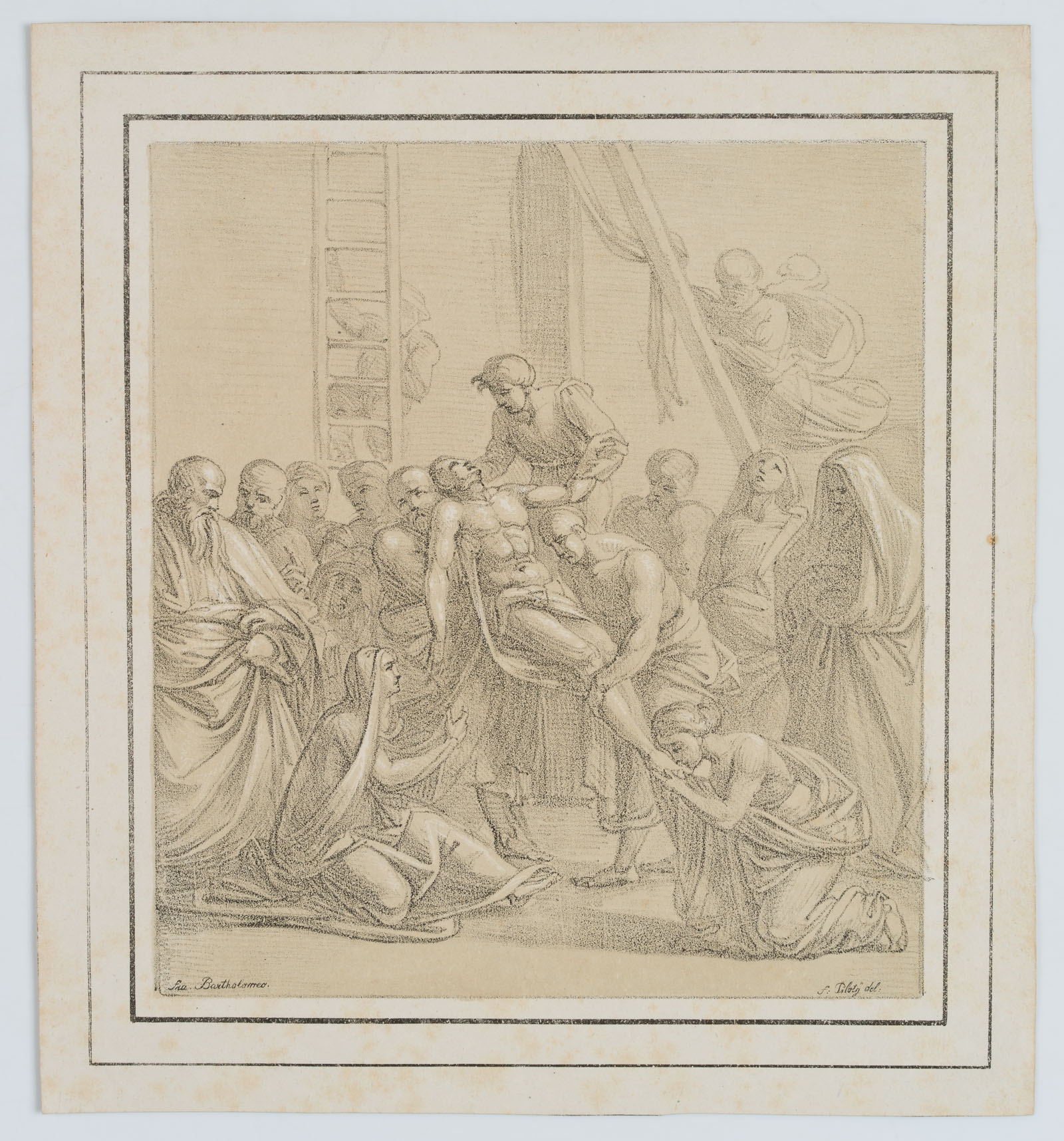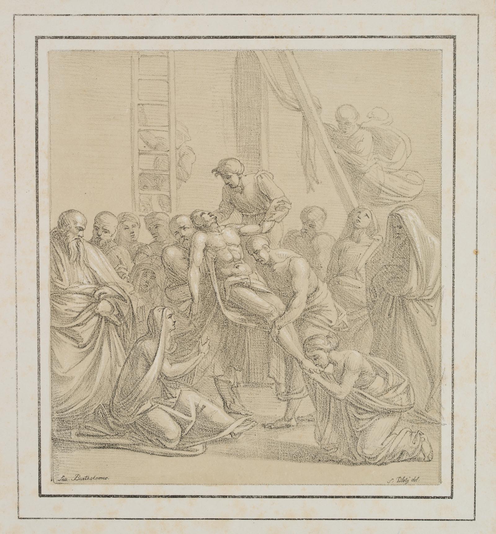 • Description: “Two men hold the body, with staffage and two kneelers, behind them another servant on the ladder. The woman in front kneels and kisses the feet. Signed inside below: “fra Bartholomeo // f: Piloty del:”; drawing Gr.Sammlung München 2164, reproduced in reverse” (From: Winkler: Die Frühzeit der Deutschen Lithographie, p. 355″.