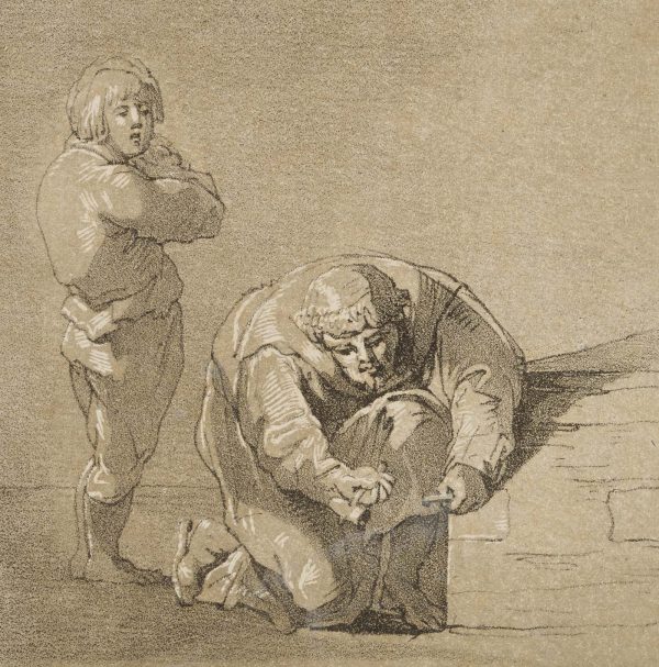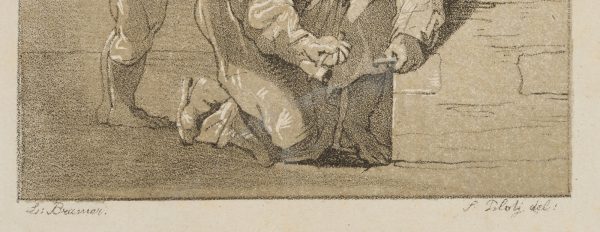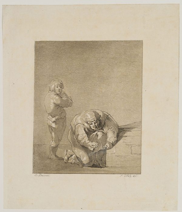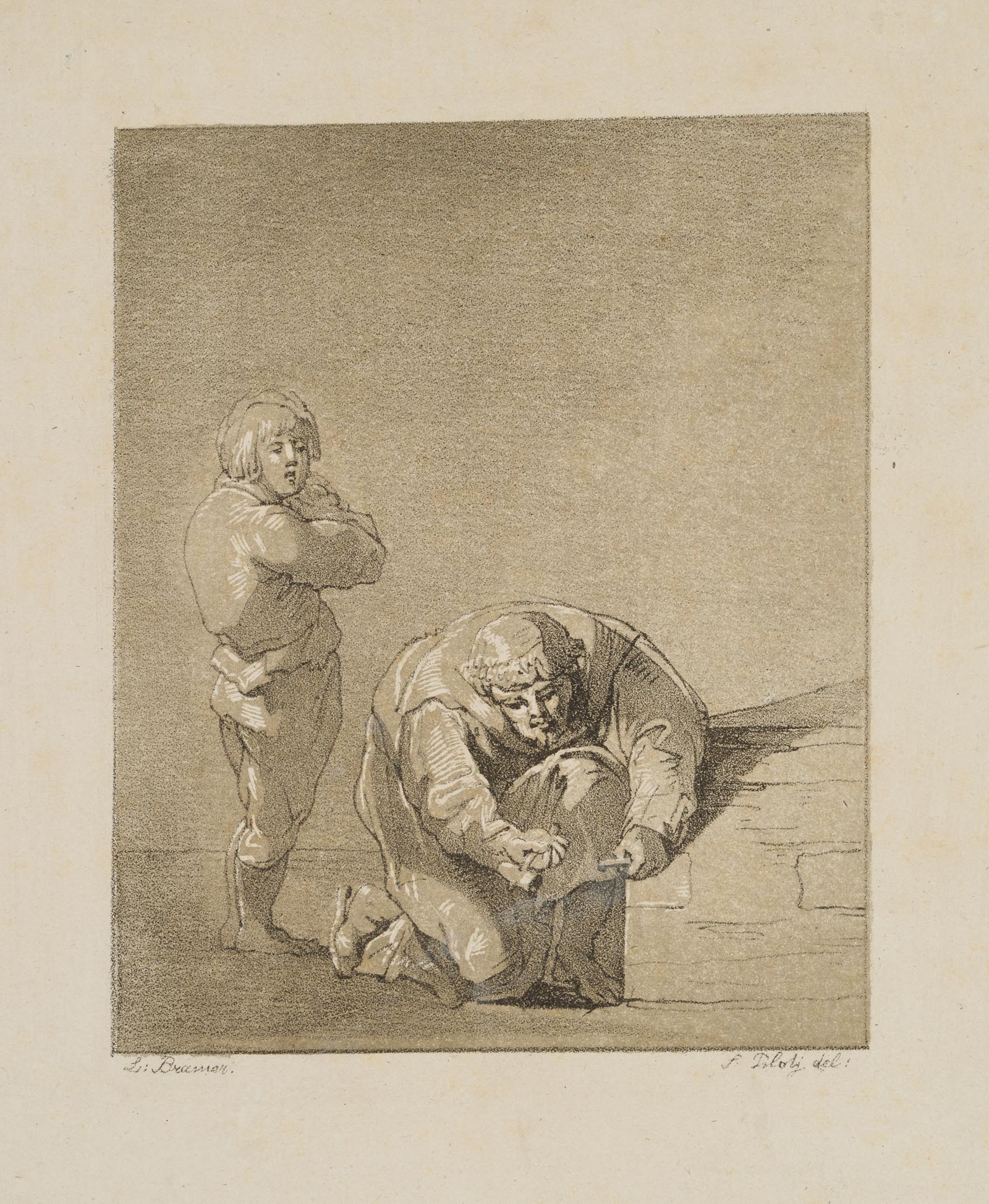 - Inscription: To the left of him stands a youth, barefoot to the right, wringing his hands. Signed below the image: “L: Bramer. //f: Pilotj del:”, listed in Winkler: Die Frühzeit der Deutschen Lithographie, No. 965, 66.1 / Dussler (München II) p. 157, No. LXVI.1. Munich 1811-16. After a painting from the Graphische Sammlung in Munich by Leonard Bramer.