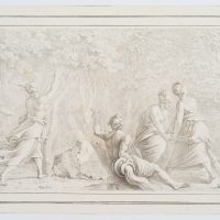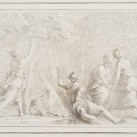 - Description: Signed at the bottom: “Polidoro pinx. // f: Pilotj del:”, recorded in Winkler: Die Frühzeit der Deutschen Lithographie, No. 965, 27.6. / Dussler p.145 No. XXVI, 6. Munich 1811-16. In front of the backdrop of trees, the god camps in the centre, turned backwards and giving instructions. He leans on the vessel from which the river flows.
