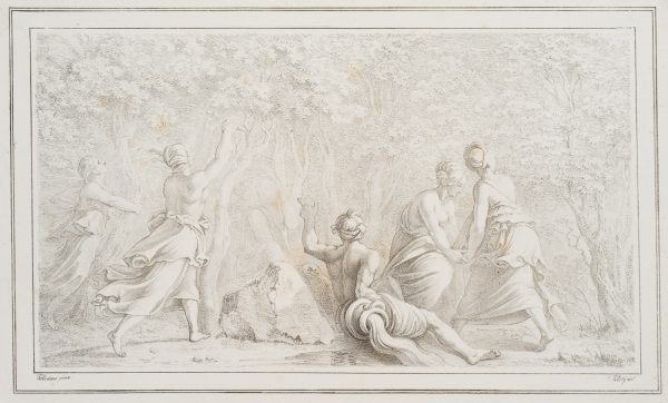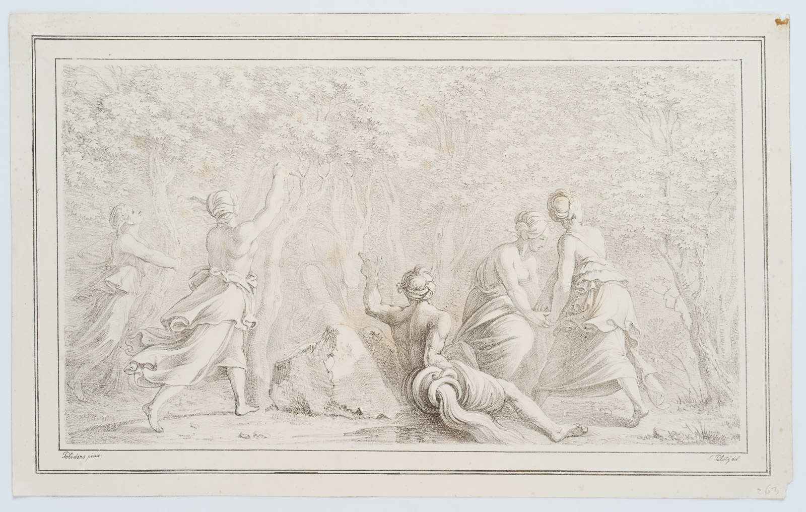 - Bezeichnung: Rechts zwei Nymphen, die einen Stein tragen, links zwei andere, die Bäume anrufend.
