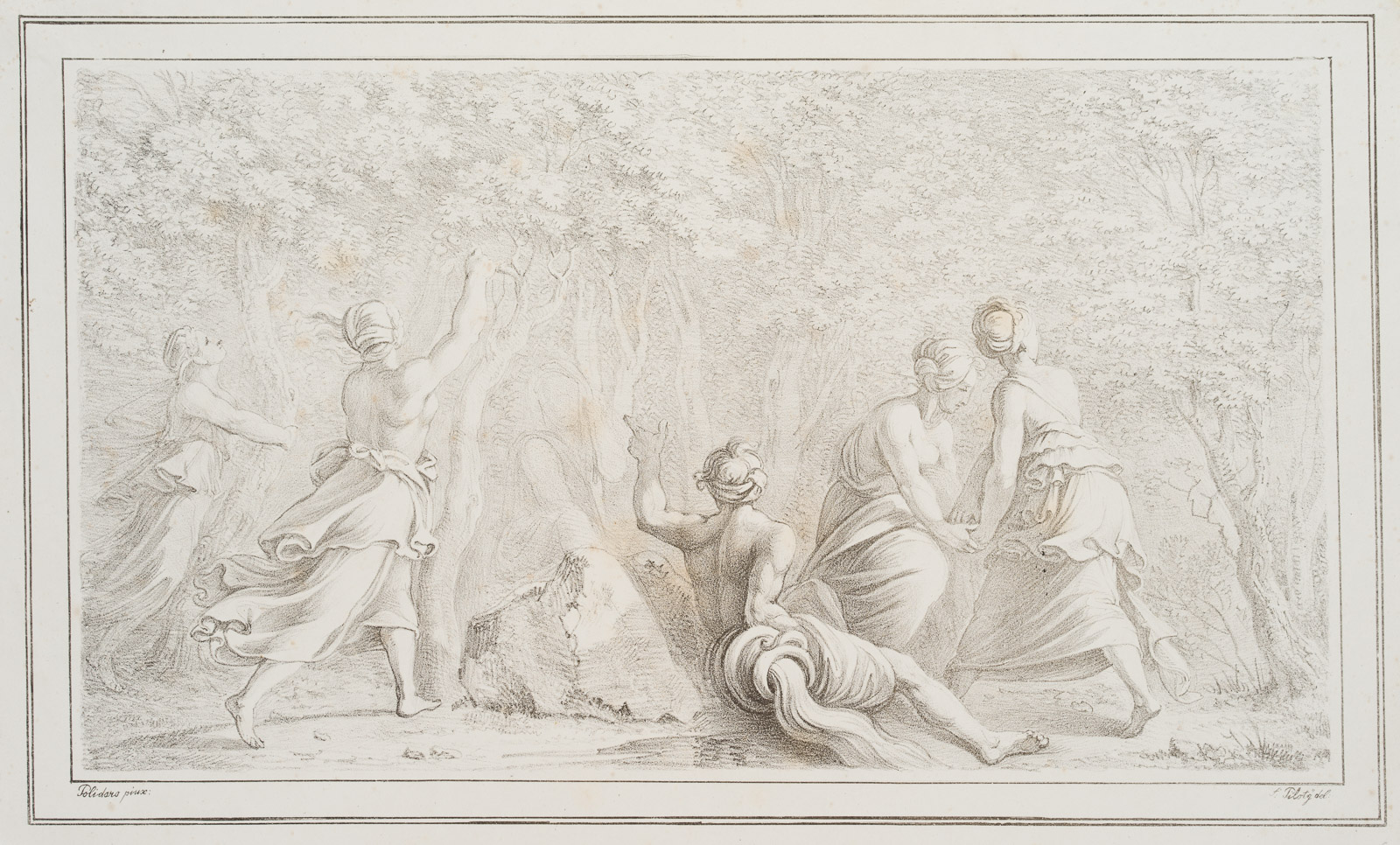 - Inscription: On the right two nymphs carrying a stone, on the left two others calling to the trees.