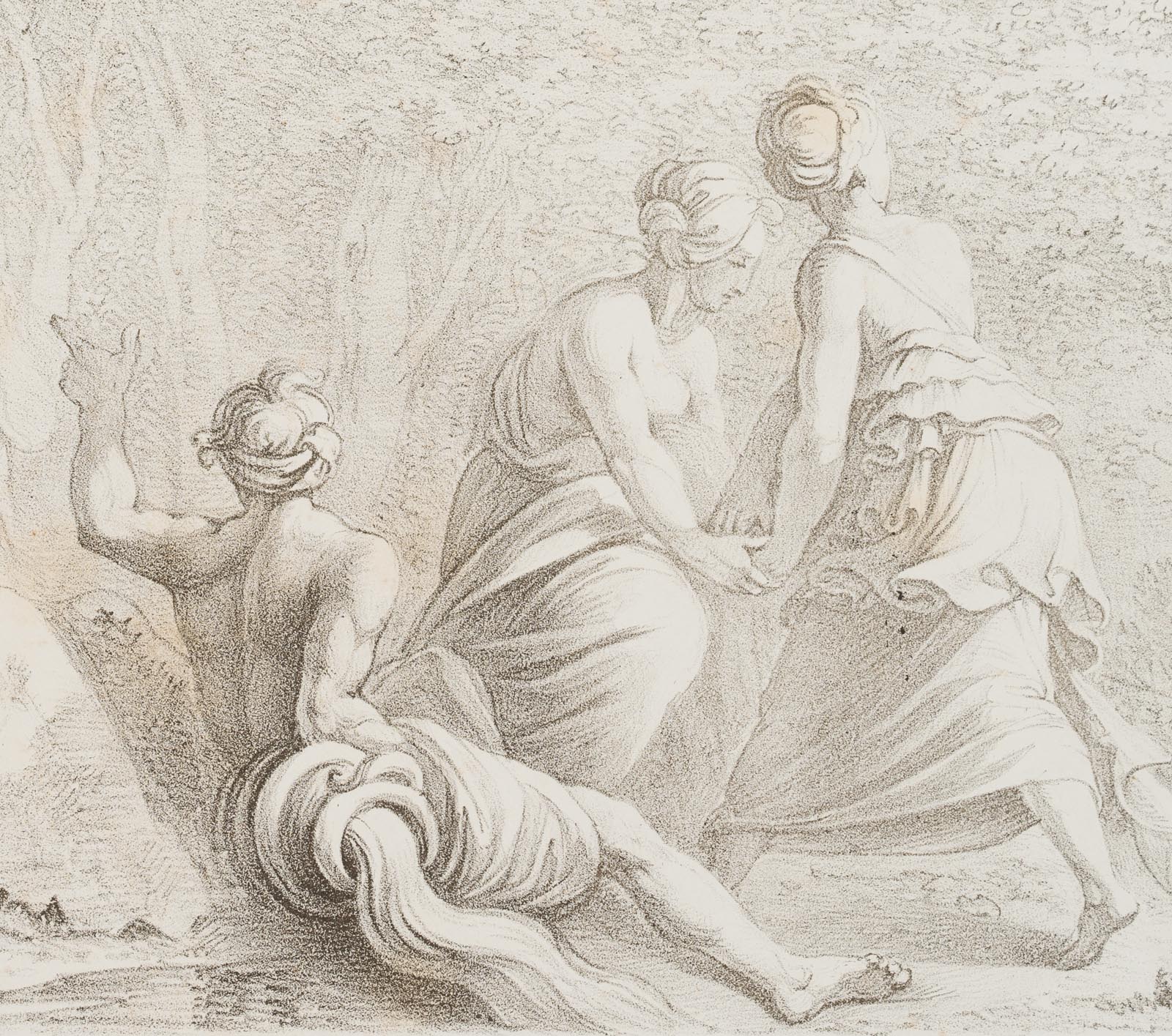 Ferdinand Piloty d. Ä. (1786 Homburg – 1844 München) nach Polidoro da Caravaggio (1493 Caravaggio – 1543 Messina), “Flussgott und Nymphen im Walde”, Inkunabel der Lithographie, um 1815, Lithographie
