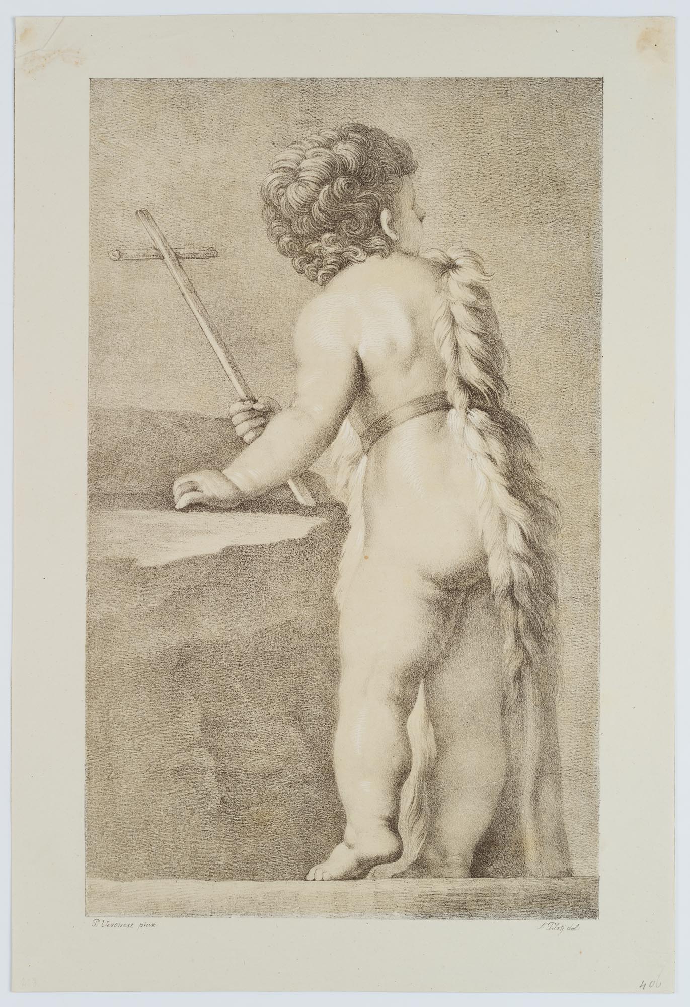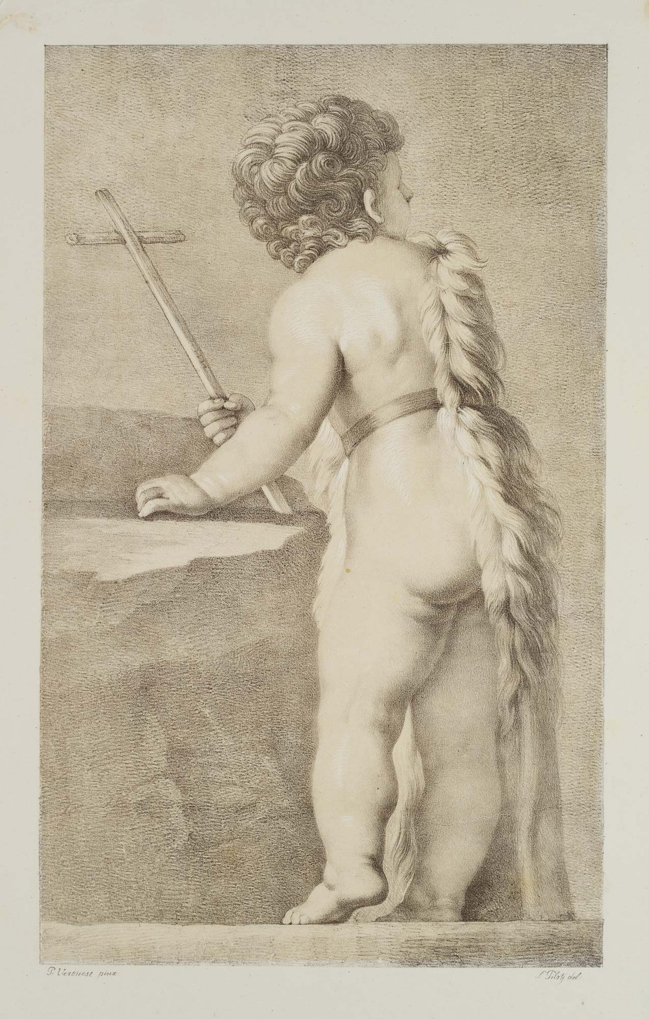 - Description: Signed below the depiction: “P: Veronese pinx. // f: Pilotj del “, listed in Winkler: Die Frühzeit der Deutschen Lithographie, No. 965, 38.6. / Dussler p. 148, No. XXXVIL, 6. Munich 1811-16. Seen from the back, the left hand resting on a rock, in the right one a cross. A strap around the middle of the body holds a fleece laid over the right shoulder. | Watermark: A. HUBER