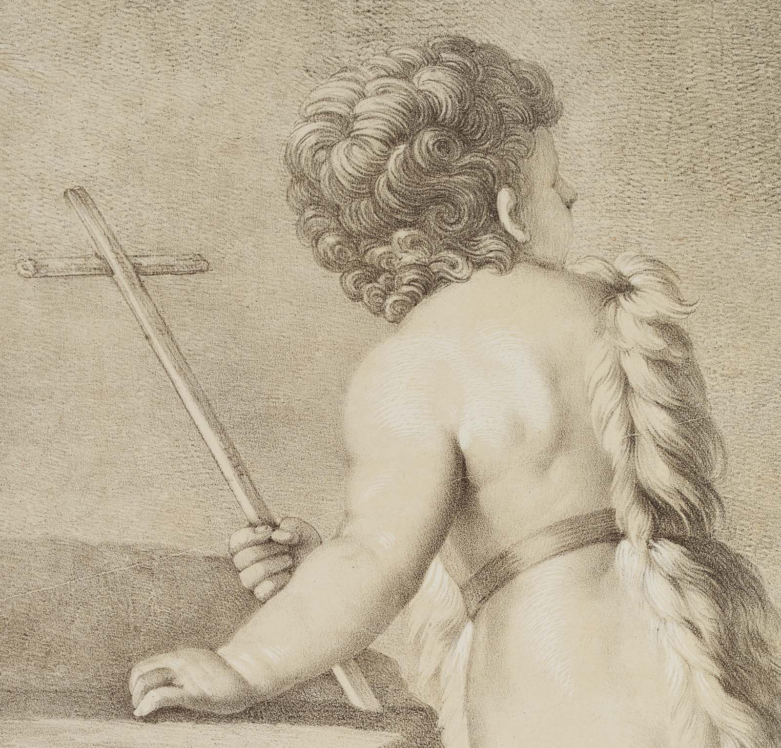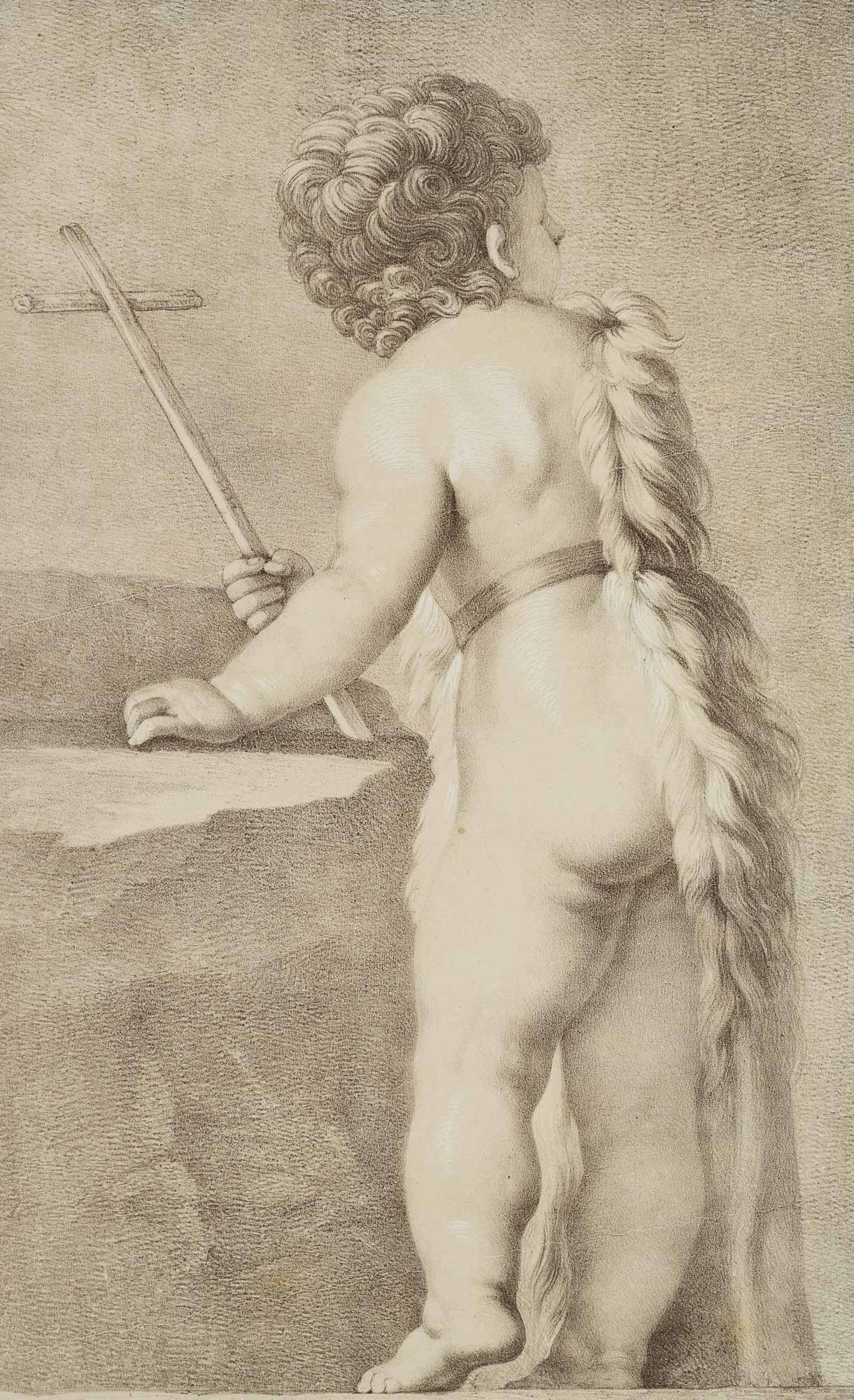 - Beschreibung: Unter der Darstellung signiert: “P: Veronese pinx. // f: Pilotj del “, verzeichnet bei Winkler: Die Frühzeit der Deutschen Lithographie, No. 965, 38.6. / Dussler S. 148, No. XXXVIL, 6. München 1811-16. Vom Rücken gesehen, die linke Hand auf einen Felsen aufgestützt, in der rechten ein Kreuz. Ein Riemen um die Körpermitte hält ein über die rechte Schulter gelegtes Vlies fest. | Wasserzeichen: A. HUBER