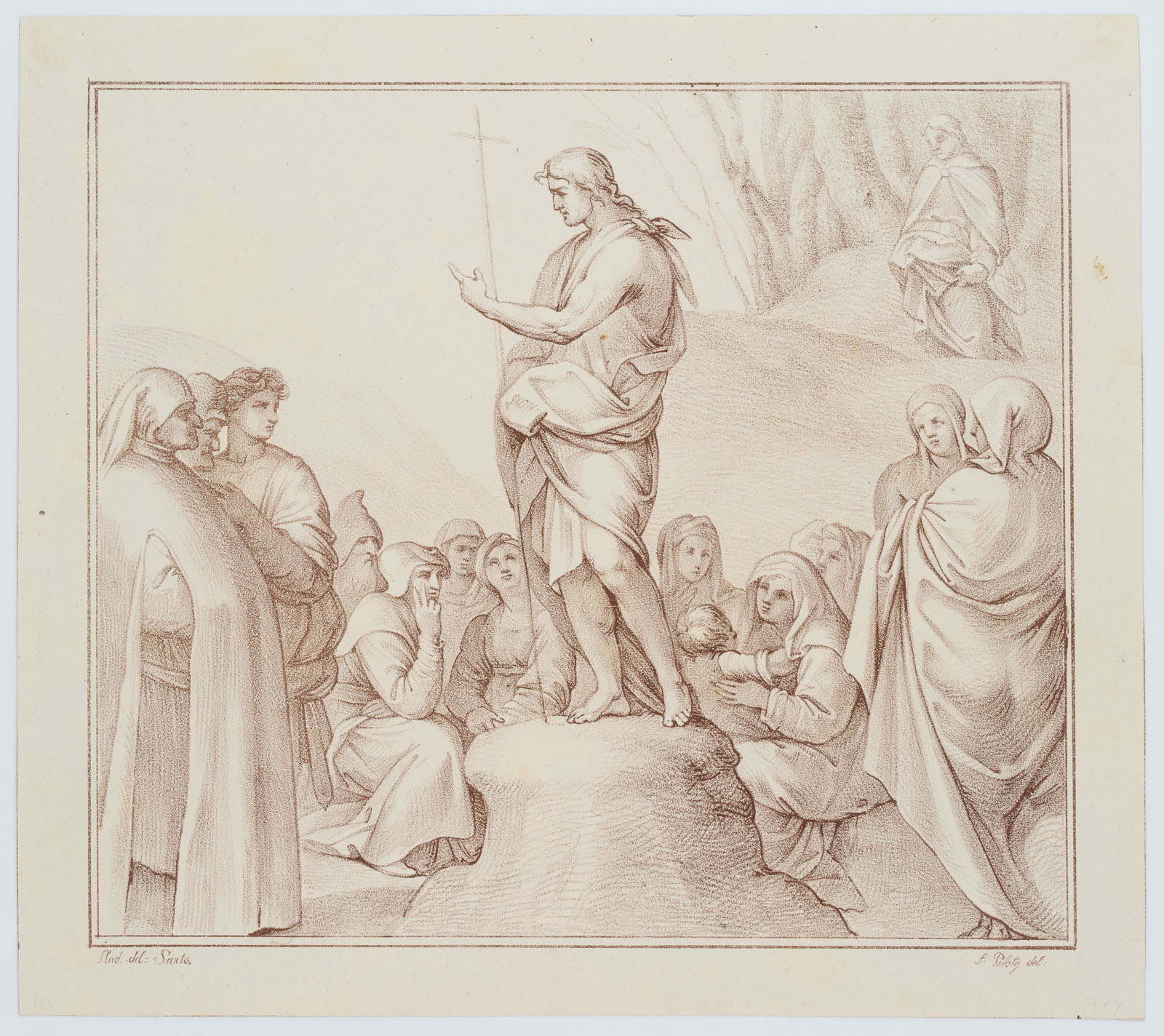 - Beschreibung: Unter der Darstellung signiert: “And: del: Sarto. // f: Pilotj del:”, verzeichnet bei Winkler: Die Frühzeit der Deutschen Lithographie, No. 965, 26.5. / Dussler S. 144, No. XXVI, 5. München 1811-16. Er steht auf einem Stein nach links gewandt, um ihn herum stehende und sitzende Zuhörer.