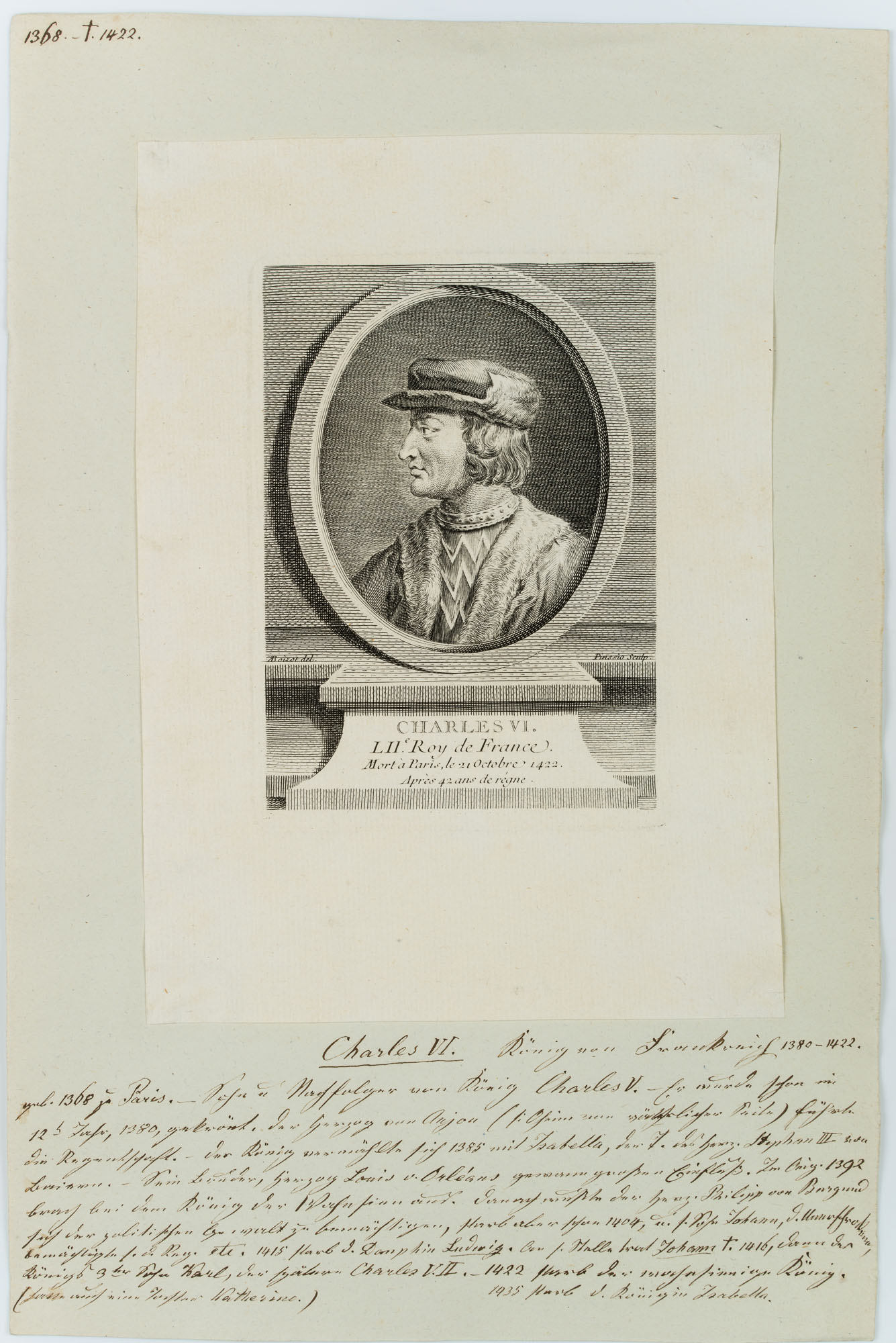 - Beschreibung: bezeichnet rechts in der Darstellung “Pinssio Sculp.”, bezeichnet links in der Darstellung “ABoizot del.”, benannt “Charles VI/LIIe Roy de France”.