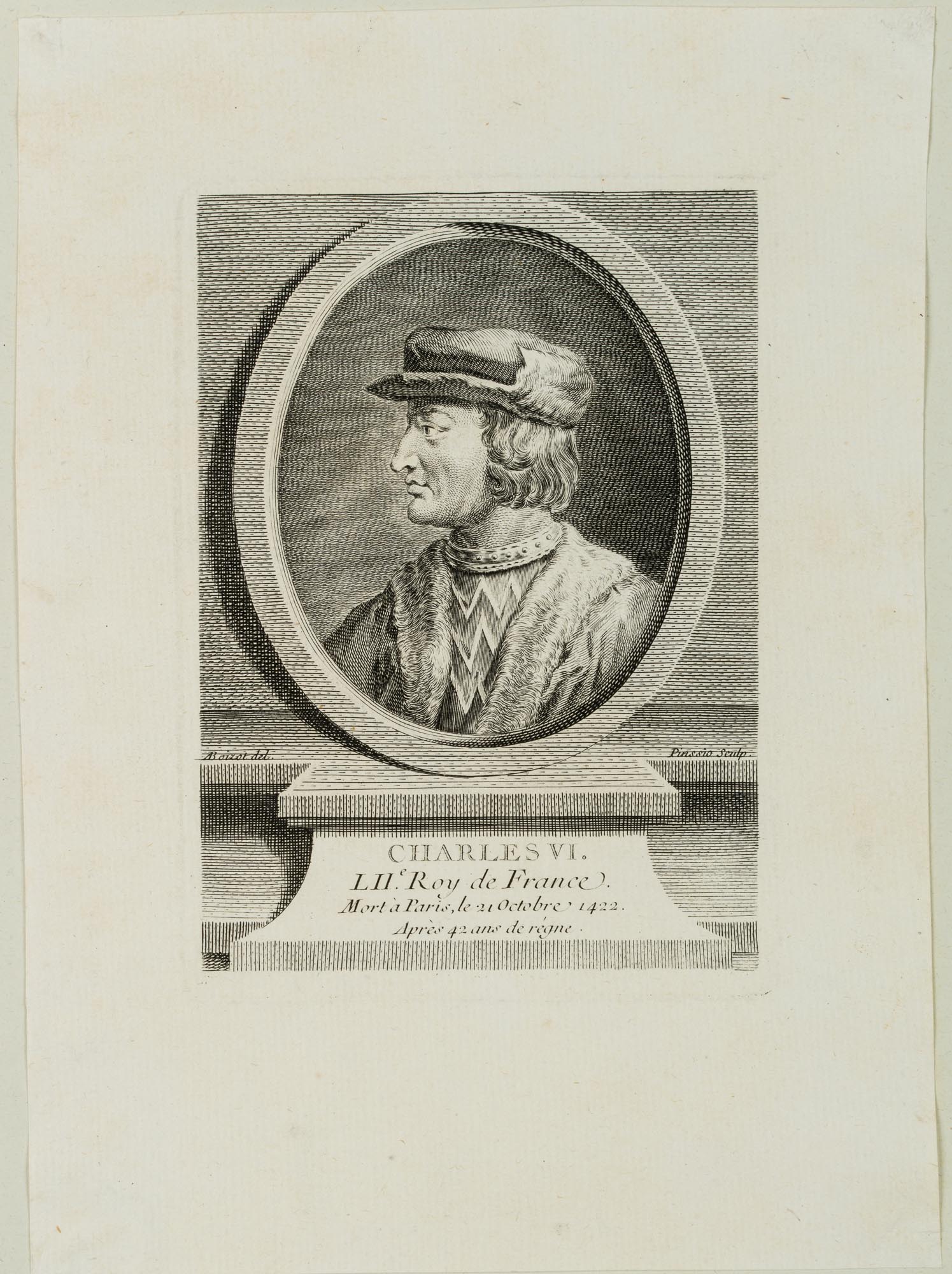 - Description: inscribed on the right in the image “Pinssio Sculp.”, inscribed on the left in the image “ABoizot del.”, named “Charles VI/LIIe Roy de France”.