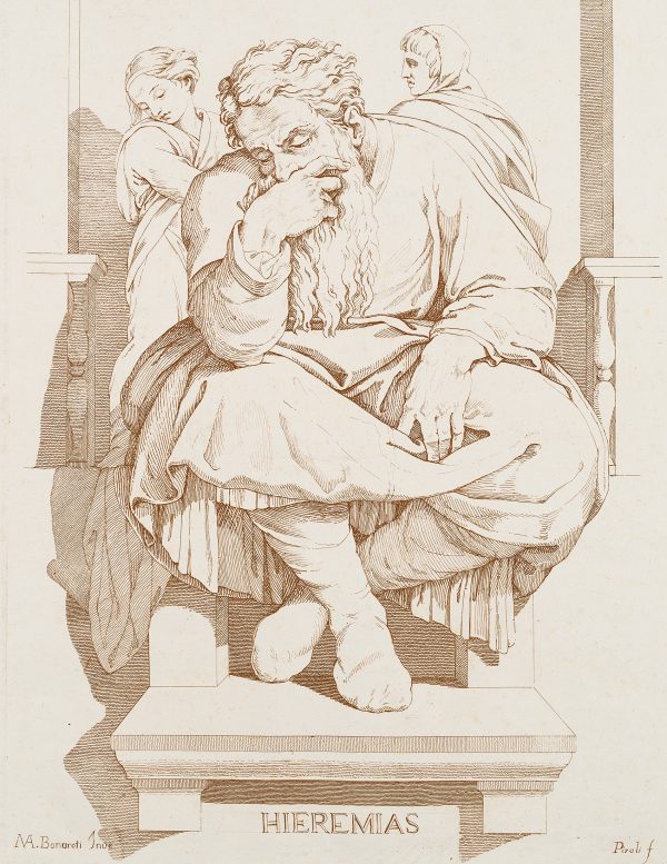 - Description: The depiction follows the figure of Jeremiah from Michelangeol’s ceiling paintings in the Sistine Chapel and shows the seated prophet in a mourning posture, covering his mouth with his right hand.