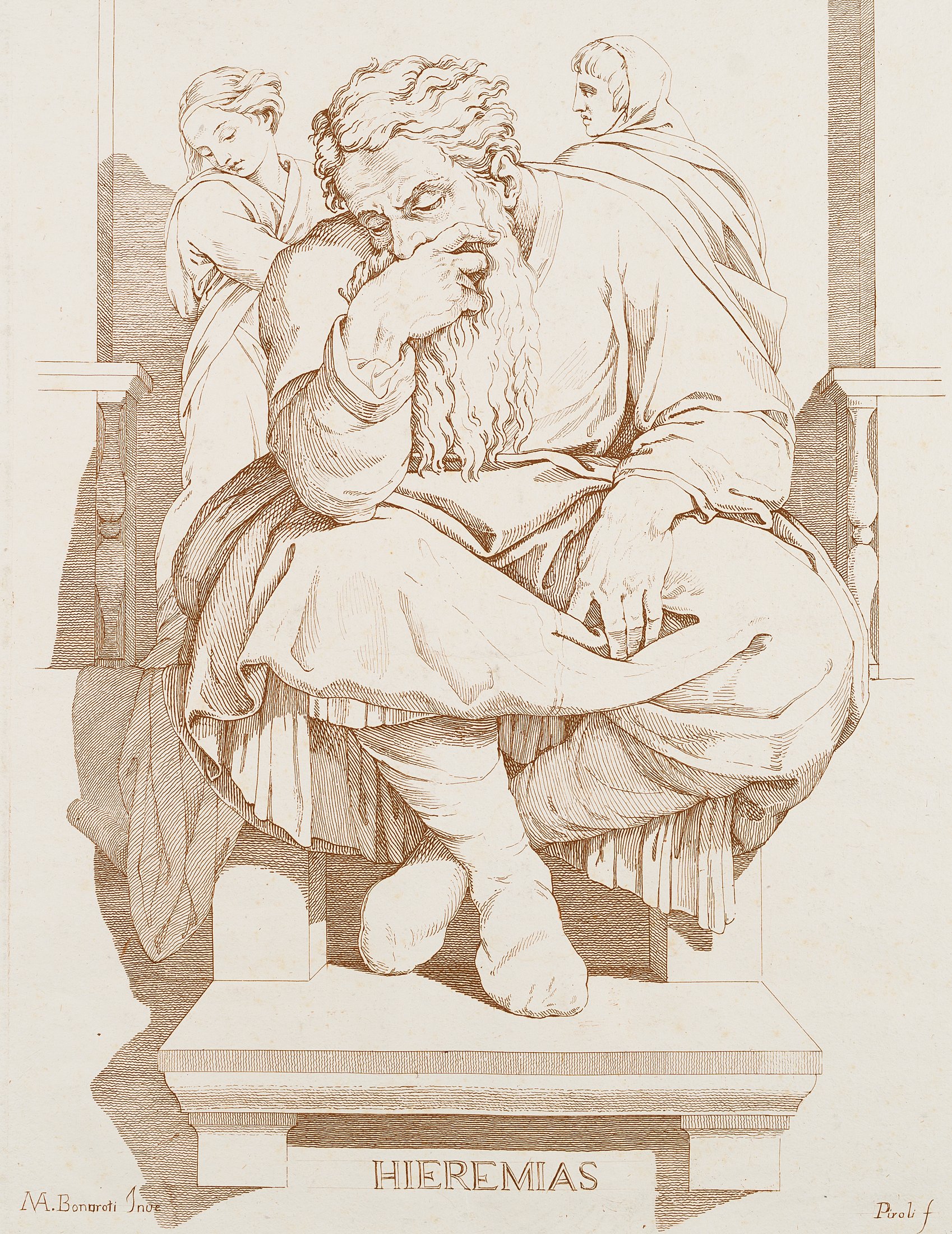 - Inscription: Lower middle signed: “: “HIEREMIAS/MA. Bonaroti Inve”, “Piroli f.'”.
