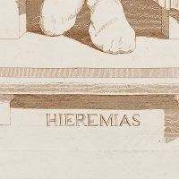 - Beschreibung: Die Darstellung folgt den der Figur des Jeremias aus den Deckengemälden Michelangeols in der Sixtinischen Kapelle und zeigt den sitzenden Propheten in einer trauerndern Haltung, den Mund mit der rechten Hand bedeckend.