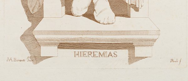 - Bezeichnung: Unten mittig signiert: “: “HIEREMIAS/MA. Bonaroti Inve”, “Piroli f.'”.