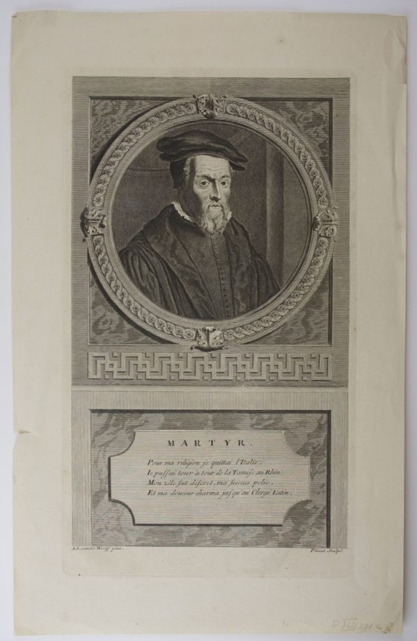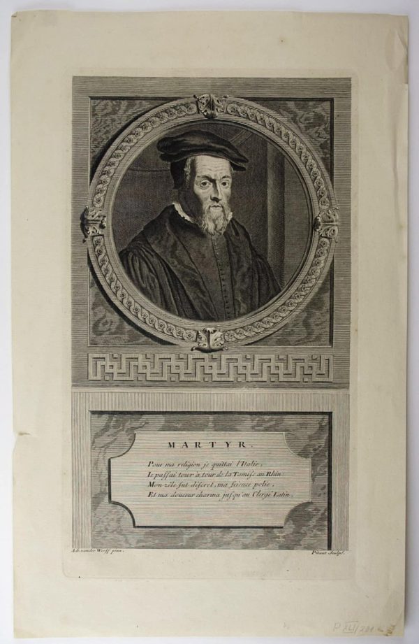 - Beschreibung: Pitaut, Porträt des Peter Martyr Vermigli, Kupferstich nach Adriaen van der Werff, um 1700. Beschreibung: Kupferstich von Pitaut, bezeichnet: “Martyr”, darunter einige Verse in französischer Sprache, darunter: “Adr. vander Werff pinx Pitaut Sculps”. Adriaen van der Werff (Rotterdam 1659 – Rotterdam 1722) war niederländischer Maler, Radierer, Zeichner und Architekt. Er war u. a. in Rotterdam und Düsseldorf tätig. Peter Martyr Vermigli, eigentlich Pietro Mariano Vermigli (Florenz 1499 – Zürich 1562) war reformierter Theologe, Augustiner in Fiesole, Abt in Spoleto und schließlich Professor in Straßburg, Oxford und Zürich.