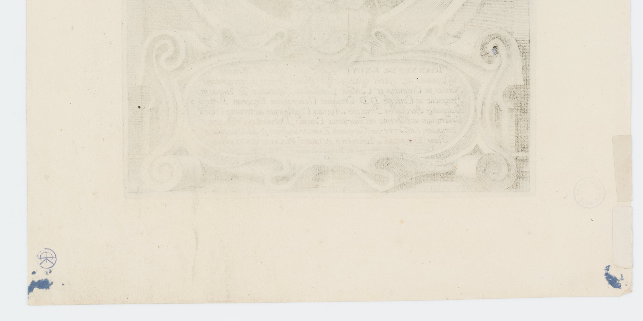 - Inscription: Inscribed in the printing plate “IPSE FACIET.”, inscribed below the depiction with the sitter’s name as well as titles and coat of arms, signed and dated at the bottom by the artist “Anselmus van Hulle pinxit”, “accessit Privilegium Cæsareum 1648” and “Paulus Pontius sculpsit”, inscribed at the bottom “Cum privilegio Regum et Hollandiæ Ordinum.”, collection stamp on verso “Sammlung Scharfen” (Lugt no. 3951) and collection stamp “EK” Sammlung Erhard Oskar Kaps, Leipzig (Lugt no. 3549).