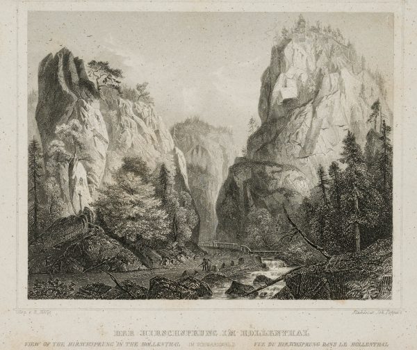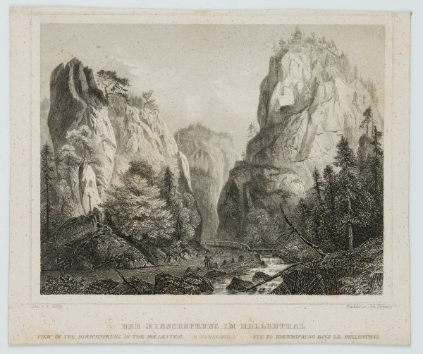 - Inscription: Inscribed below the decorative frame: „Gez. V. R. Höfle / Stahlst. v. Joh. Poppel.“ Below titled „Der Hirschsprung im Hoellenthal / View of the Hirschsprung in the Höllenthal / Vue du Hirschsprung dans le Höllenthal“.