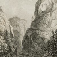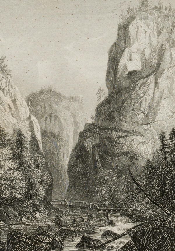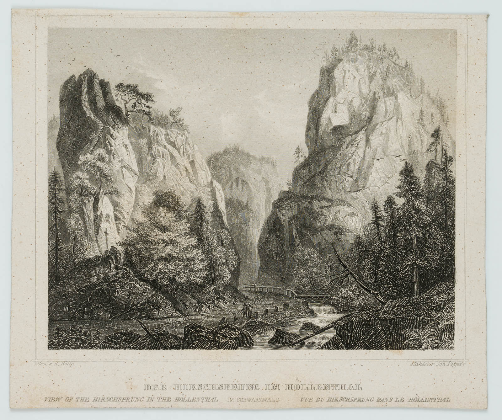 - Inscription: Inscribed below the decorative frame: “Gez. V. R. Höfle / Stahlst. v. Joh. Poppel.” Below titled “Der Hirschsprung im Hoellenthal / View of the Hirschsprung in the Höllenthal / Vue du Hirschsprung dans le Höllenthal”.