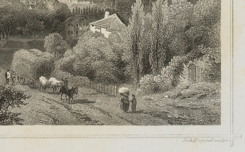 - Description: View of the town from the southwest with the surrounding countryside. In the foreground farmers with hay carts and shepherds can be seen. After an original by Ludwig Rohbock (1824 Nuremberg – 1893 Munich).