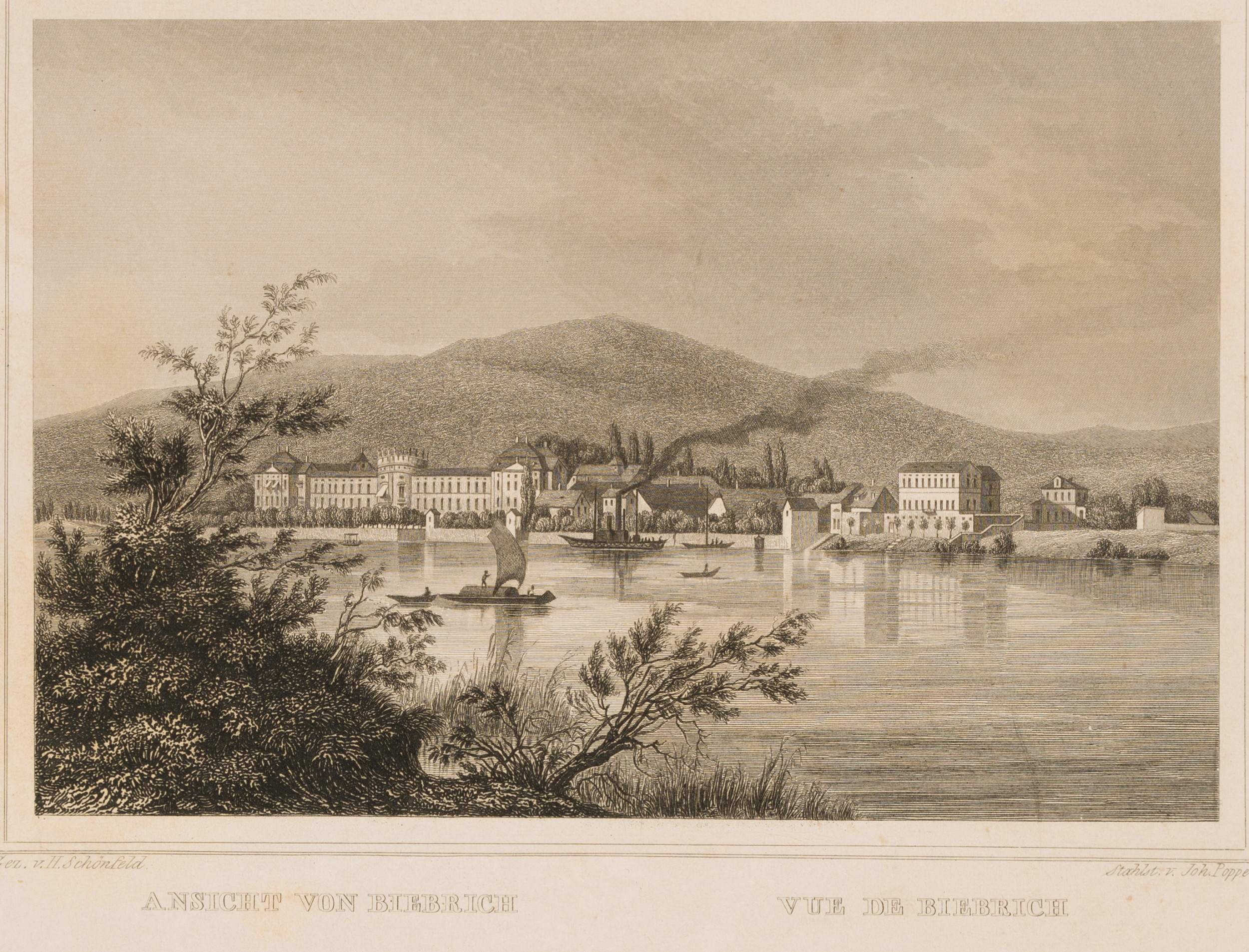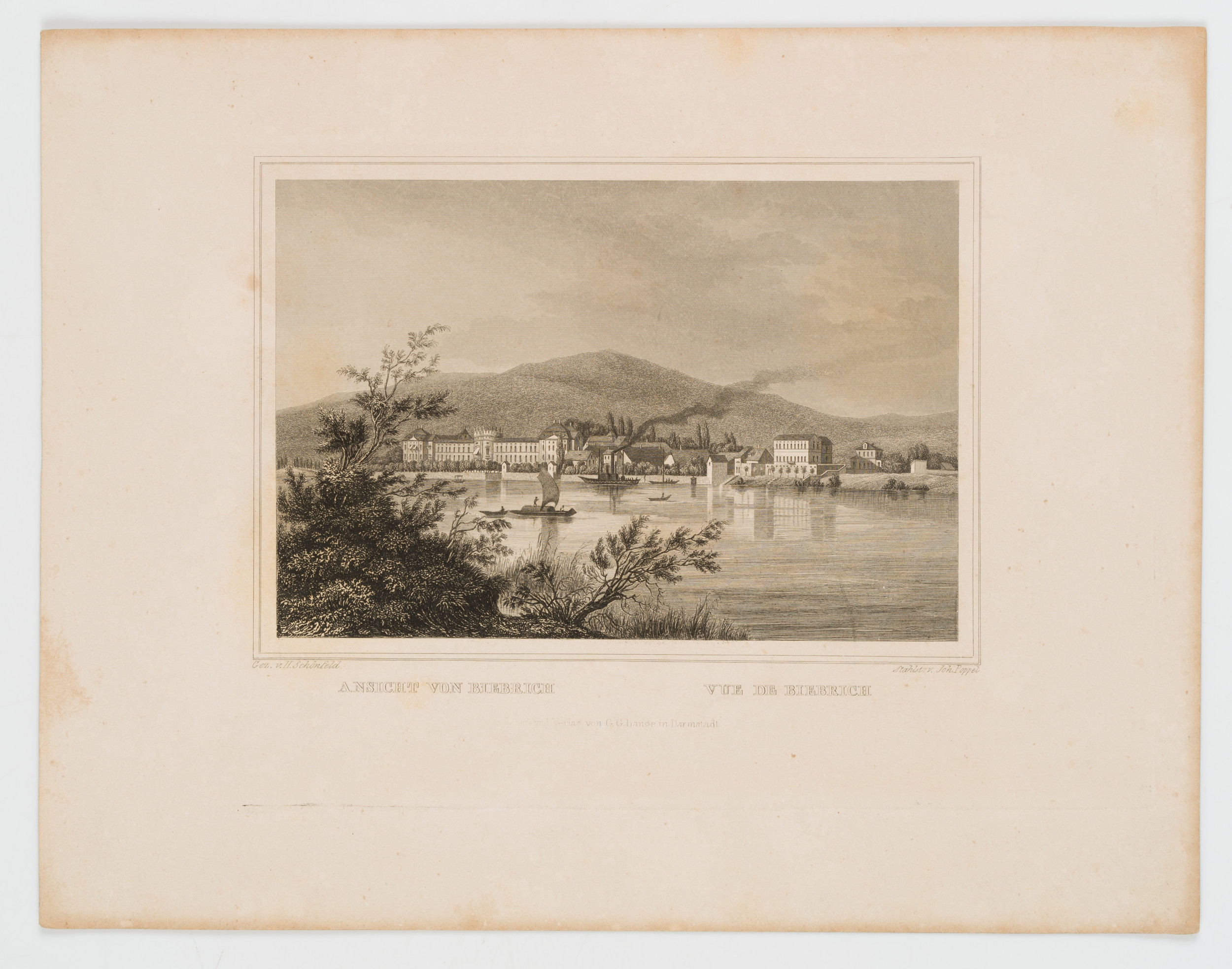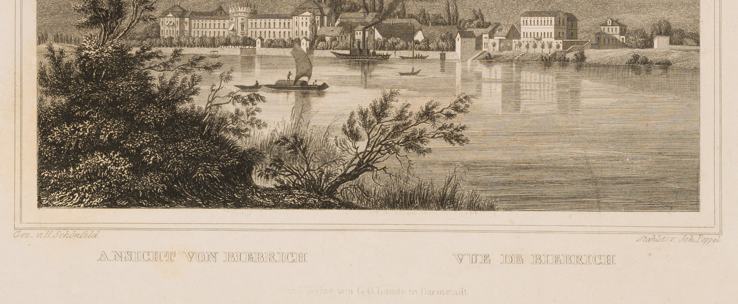 - Inscription: Lower middle signed in the printing plate: “Gez. v. H. Schönfeld | Stahlst. v. Joh. Poppel”. Lower middle inscribed in the printing plate: “Ansicht von Biebrich | Vue de Biebrich”.