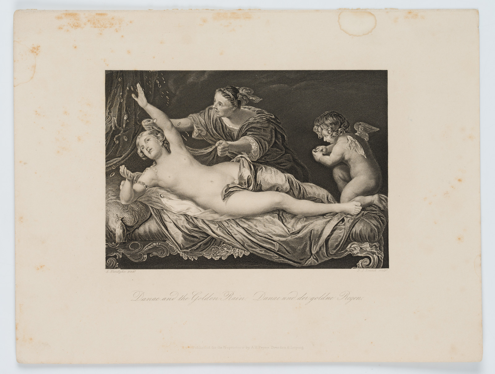 - Description: Steel engraving after the painting by Anthonis van Dyck depicting Danae receiving Zeus in the form of a shower of gold.