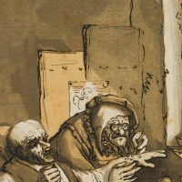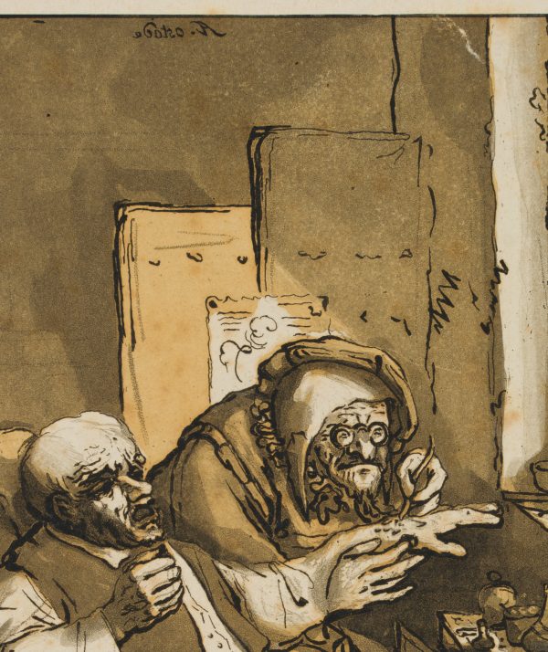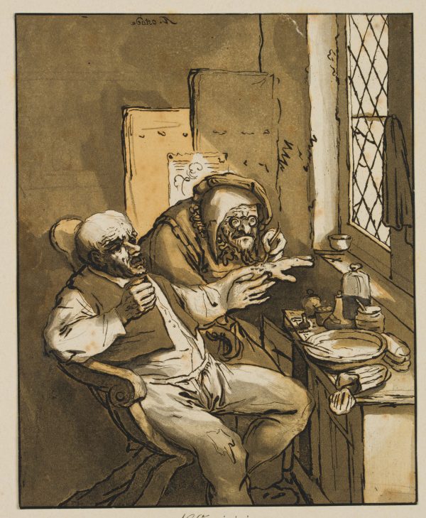 - Beschreibung: Alter Mann in der Stube eines Heilers oder Quacksalbers. Mehrfarbige Aquatinta von mehreren Platten. Darstellung mit karikierenden Zügen.
