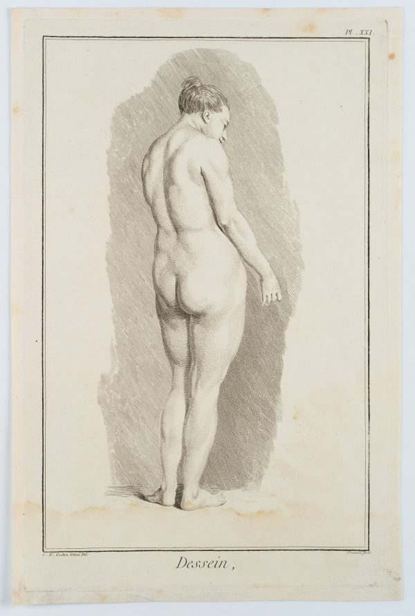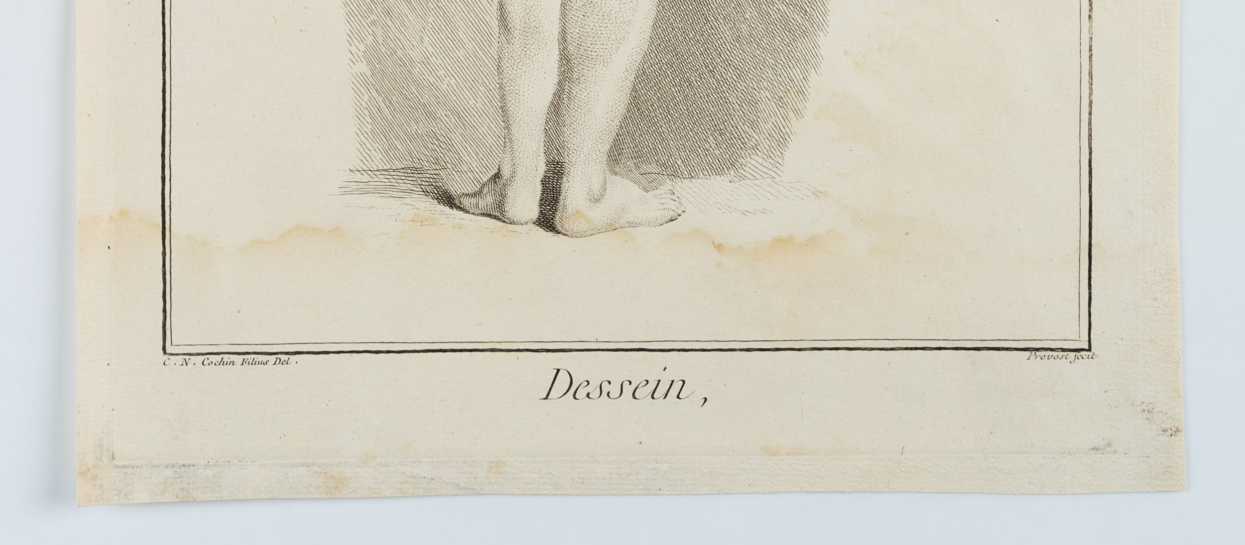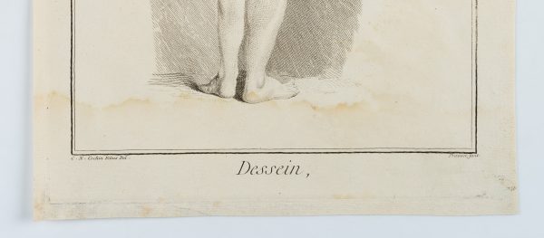 - Inscription: Lower middle signed in the printing plate: “C. N. Cochin Filius Del. / Prevost fecit”. Lower middle inscribed in the printing plate: “Dessein,”. Upper right numbered in the printing plate: “Pl. XXI.”.