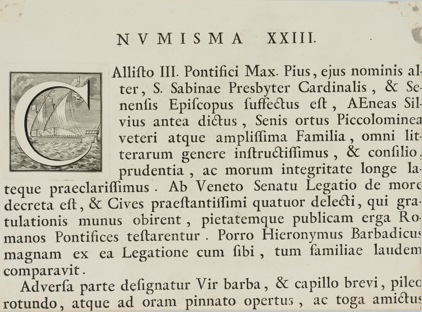 • Bezeichnung: Unten mittig monogrammiert “R.V.A. Fec.”. Aus: Numismata vivorum illustrium ex gente Barbadica. Verso mit lateinischem Text (“Numisma XXII…”) und weiterem Kupferstich (7 x 6,2 cm).